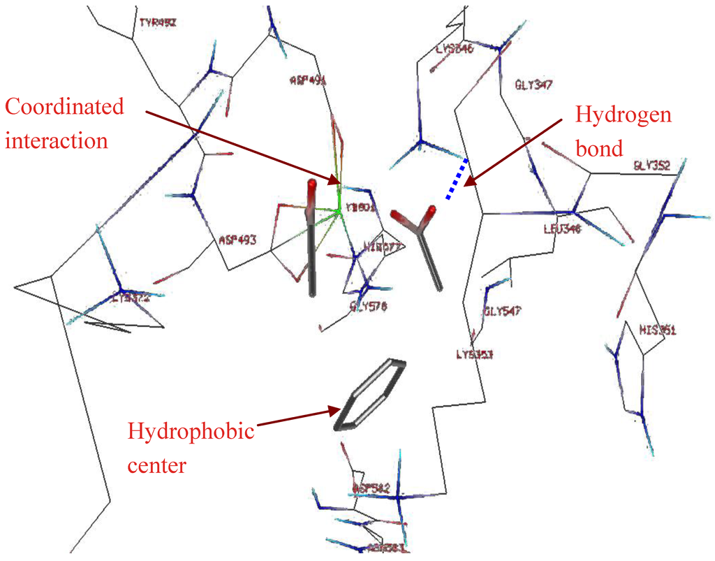 A fragment library was built that contained small molecules with at most one rotatable bond. The HINT program was used to select those fragments that bound to areas in the active site of EF. The Hydropathic INTeractions, or HINT, program [,,] uses experimental solvent partitioning data as a basis for calculating free energy scores of binding. Interaction energy calculations used to score fragment binding included terms for hydrophobic, ionic, and hydrogen bond interactions (Figure 2 and Figure 3). Initially, a smaller library, from the NCI, was screened with the pharmacophore and 8 compounds selected from this list that had particularly good scores with the FlexX docking program. Then these compounds were used to identify larger fragments that were used to screen the ZINC library for compounds.