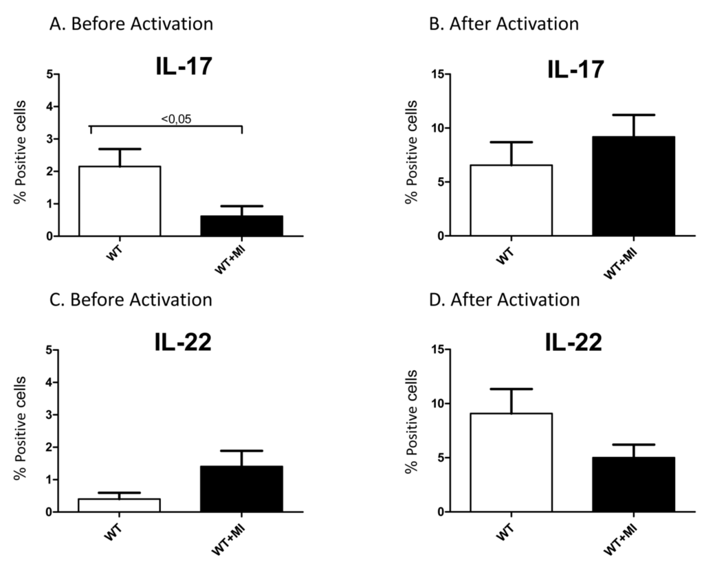 Figure 1. A and B. Percentages of positive splenocytes isolated from either sham-operated wild-type mice (WT) or WT with myocardial infarction induced through left coronary artery ligation three days earlier (WT + MI). Intracellular labeling with antibodies against IL-17 was performed on intact splenocytes (A) or splenocytes activated with PMA plus ionomycin for 4 h before labeling (B). C and D. Percentages of positive cells labeled intracellularly with anti-IL-22 antibodies. The cells were either unstimulated (C) or were activated with PMA plus ionomycin for 4 h before labeling (D). Mean ± SEM of 5 experiments are shown.