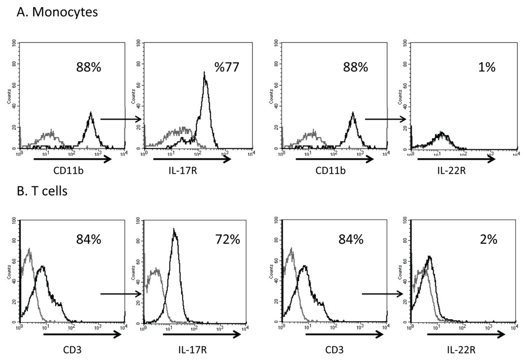 Figure 2. (A) Monocytes were isolated by monocyte enrichment kit and were labeled with anti-CD11b. About 88% of monocytes were labeled with this antibody. This population was then stained with either anti-IL-17R or anti-IL-22R; (B) T cells were isolated using a T cell enrichment kit, labeled with anti-CD3 and then with anti-IL-17R or anti-IL-22R. One representative experiment indicating the percentages of positive cells is shown.