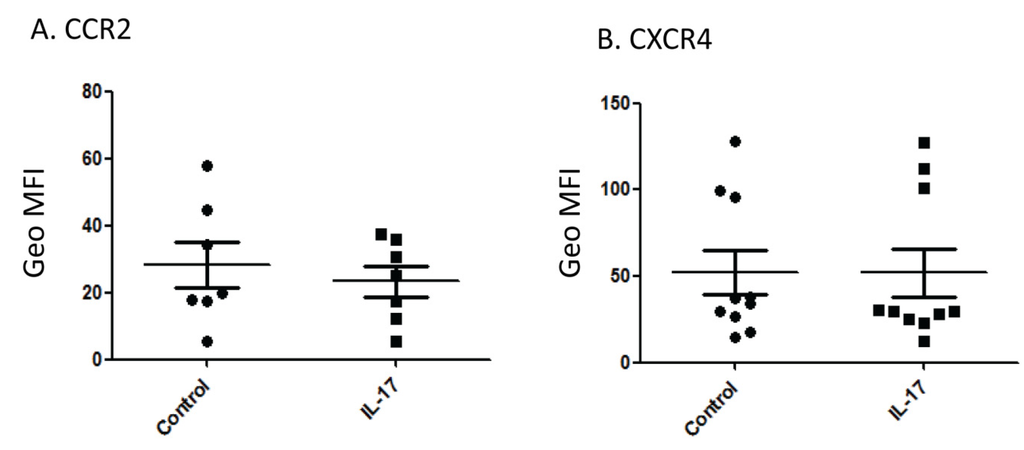 Figure 3. IL-17 may reduce the expression of CCR2 and CXCR4 on the surface of monocytes. Monocytes (1 × 106) were either left intact (Control) or were pretreated with 250 ng/mL of IL-17 overnight. They were washed and then examined for the expression of CCR2 (A) or CXCR4 (B). The geometric mean of fluorescence intensity (Geo MFI) is shown. Each dot represents one independent experiment.