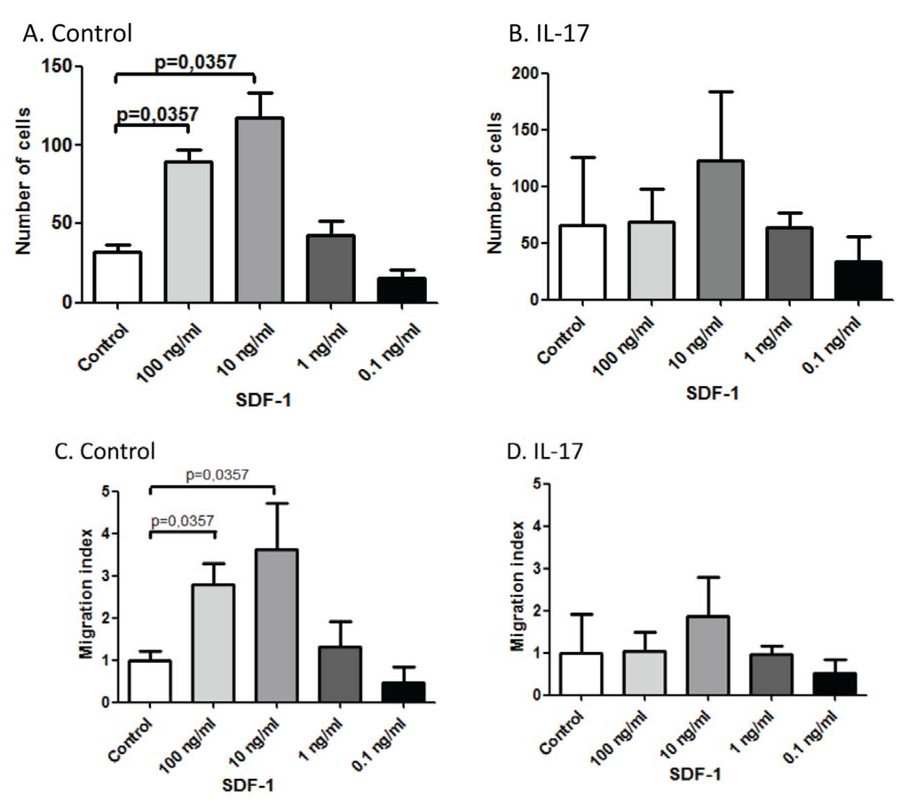 Figure 5. IL-17 inhibits the chemotaxis of monocytes towards SDF-1α/CXCL12. (A) and (B) Monocytes were either untreated (control cells) or pretreated with 250 ng/mL IL-17 overnight. The cells were washed, labeled with calcein-AM and then examined for migration towards various concentrations of SDF-1α/CXCL12; (C) and (D) Migration index was calculated by measuring the numbers of migrating cells into the lower filters of the chemotaxis chambers. Mean ± SEM of two experiments are shown.