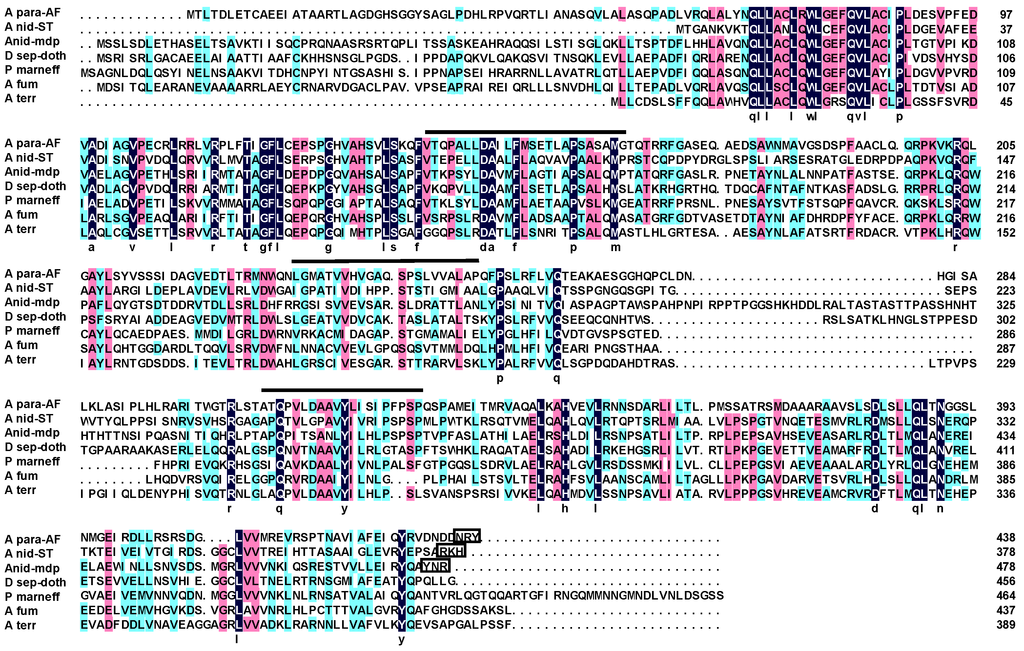Alignment of putative AflJ homologs from different species. Amino acids marked in black are conserved in all species; whereas those marked in red or blue indicate ≥75% and ≥50% homology, respectively. Abbreviations are: A para-AF, A. parasiticus aflatoxin cluster AflJ AAS66019.1; A nid-ST, A. nidulans sterigmatocystin cluster AflJ (ANID_7819); A nid mdp, A. nidulans monodictyphenone cluster AflJ (ANID_10021); D. sep-doth, Dothistroma septosporum dothistromin cluster AflJ (R. Bradshaw, personal communication, see supplementary materials); P marneff, Penicillium marneffei XP_002149634.1; A fum, A. fumigatus XP_751378; A terr, A. terreus XP_001217073.1. Lines over the sequence indicate regions identified in A. parasiticus and A. flavus as membrane spanning regions. The sequences boxed at the C-terminal end of the AflJ sequences are putative microbodies targeting sequences [21].