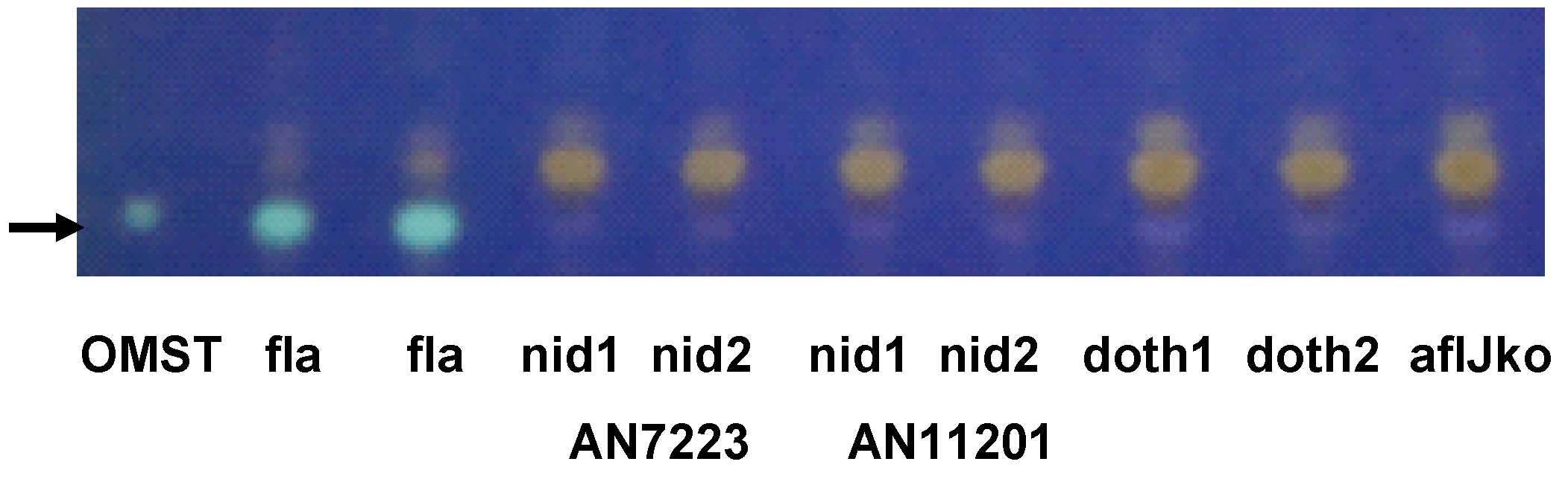 Thin layer chromatography of acetone extracts of two separate A. parasiticus SRRC2043 ΔaflJ transformants (the wild-type accumulates O-methylsterigmatocystin) grown on YES medium for 48 h. Complementation of aflJ function was tested on A. parasiticus ΔaflJ transformed with plasmid pPTRI-gpdA-aflJx-trpC where aflJx equals one of the tested aflJ gene homologs from A. flavus aflatoxin cluster (fla), A. nidulans sterigmatocystin cluster (nid AN7223), A. nidulans monodictyphenone cluster (nid AN11201), D. septosporum dothistromin biosynthesis cluster aflJ (doth, R. Bradshaw, personal comunication). The ΔaflJ mutant (aflJko) was included as the negative control. Two separate transformants were tested for each study. OMST is the O-methylsterigmatocystin standard (Sigma). Elution buffer was toluene:ethyl acetate:acetic acid (6.5:3.5:1). Cultures were extracted after 48 h growth on PDA plates.