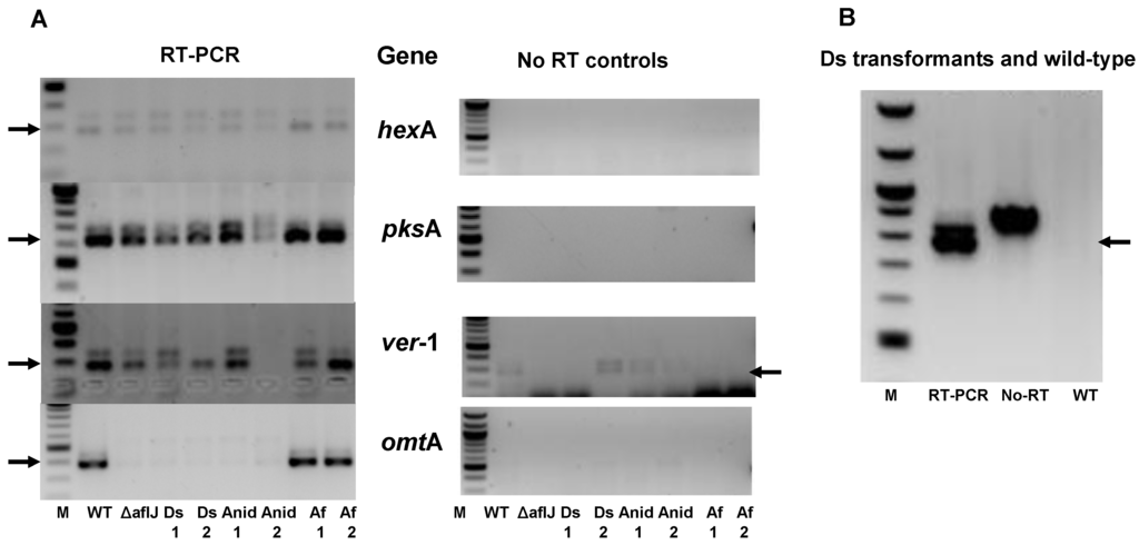 End-point RT-PCR studies. (A) RT-PCR was done on total RNA from fungal cultures grown on PDA medium for 48 h. The fungal cultures were A. parasiticus SRRC2043 ΔaflJ before and after transformation with the plasmid, pPTRI-gpdA-aflJx-trpC plasmid where aflJx stands for Dothistroma septosporum aflJ (Ds), A. nidulans AN7223 aflJ (Anid), A. flavus aflJ AAS90096 (Af). RT-PCR involved reverse transcription followed by PCR (oligonucleotide primers listed in Supplementary Materials) whereas the No RT controls used the same primer sets but omitted the reverse transcription step. The aflatoxin biosynthesis genes tested for expression were hexA, pksA, omtA, and ver-1; (B) RT-PCR was done using primers to Dothistroma septosporum aflJ introduced by transformation into A. parasiticus SRRC2043. In all cases the oligonucleotide primers sequences flanked an intron. The smaller PCR product, marked by arrows reflects amplification of the cDNA whereas the larger PCR product could be PCR from either genomic DNA or unprocessed transcript.
