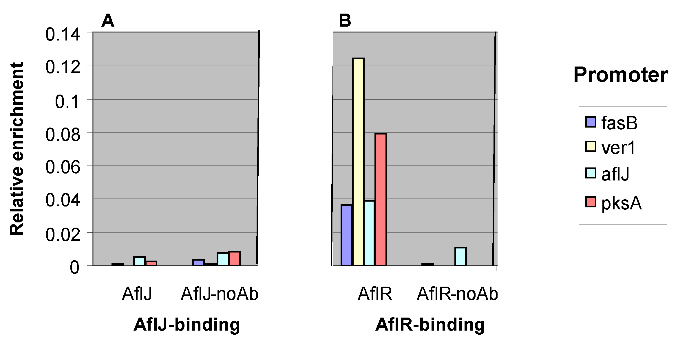 Chromatin immunoprecipitation (ChIP) to test AflJ and AflR binding to known AflR-binding sites [14]. Transformants of A. flavus CA14 harbored genes expressing N-terminal c-Myc-tagged AflR or AflJ. (A) Detection by PCR with oligonucleotides to either hexB, ver-1, aflJ, or pksA of chromatin DNA immunoprecipitated by anti-c-Myc in transformants expressing c-Myc-tagged AflJ; (B) Similar detection by PCR with the same oligonucleotides of chromatin DNA immunoprecipitated by anti-c-Myc in transformants expressing c-Myc-tagged AflR. Negative controls for both studies were DNAs isolated by ChIP in the absence of c-Myc antibody. The Y-axis (relative enrichment) is the ratio of the amount of bound DNA to input DNA given in arbitrary units.
