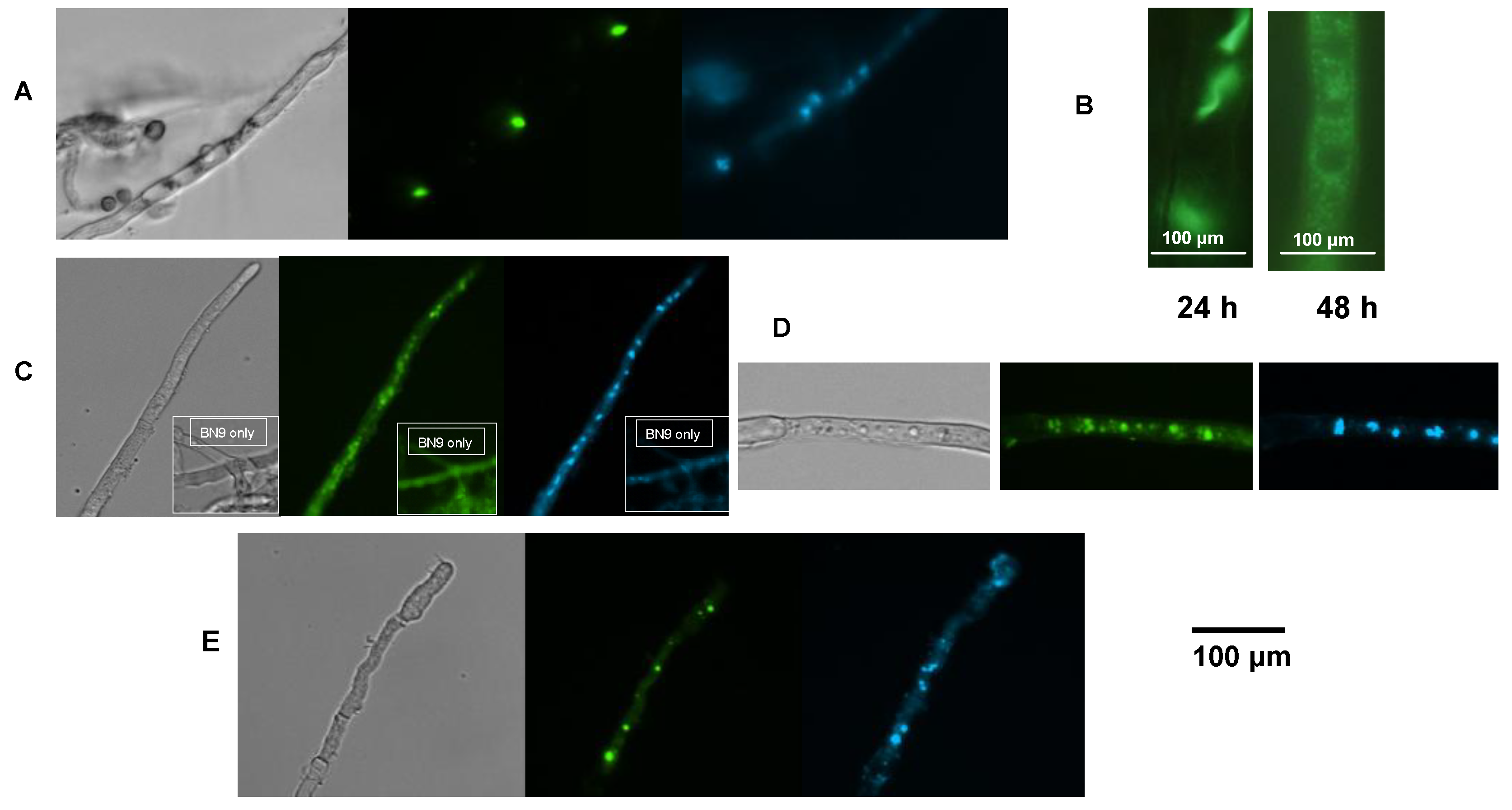 AflJ and AflR localization in A. parasiticus of GFP- and eYFP-tagged fusion proteins. (A) AflJ::GFP localization: expression of the fusion construct was under the control of the gpdA promoter. Mycelia were obtained from cultures of transformants of A. parasiticus ΔaflJ with pPTRI-gpdA-GFP::aflJ-trpC grown on PDB medium for 24 h. The mycelia was stained with DAPI and examined for fluorescence using a GFP and a DAPI filter; (B) AflJ::GFP localization when the fungi were grown on YES medium for 24 and 48 h; (C) AflJ::GFP localization when expression of the fusion protein was under control of the aflJ promoter. Fluorescence was determined on A. parasiticus mycelia when the fungus was transformed with pPTRI-aflJ promoter-GFP::aflJ-trpC terminator grown on PDB for 18 h. Insets show self-fluorescence and DAPI-fluorescence when the wild-type A. parasiticus BN9 was examined in the microscope under the same conditions; (D) AflR::GFP localization. Fluorescence was determined on A. parasiticus transformed with gpdA-YFP::aflR-trpC grown as above; (E) AflJ and AflR split YFP (BiFC) studies. Fluorescence was determined on mycelia obtained from A. flavus co-transformed with plasmids amyB-aflR::Nt-YFP and amyB-aflJ::Ct-YFP. All micrographs were acquired at 400× final magnification.
