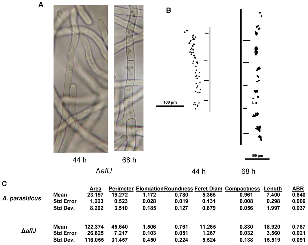 Comparison of vesicle/endosome distribution in the A. parasiticus ΔaflJ mutant grown in the dark for 44 h and 68 h on YES liquid medium. (A) Morphology of ΔaflJ was evaluated at indicated time points using bright field microscopy; (B) Binary images of the corresponding distribution of vesicles and endosomes in wild-type A. parasiticus and ΔaflJ; (C) Descriptive statistics of size and distribution of the vesicles/endosomes in Figure 5B measured by CMEIAS digital image analysis [32]. The measurement features are defined in Supplementary information.
