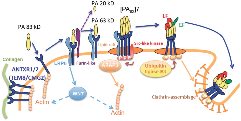The toxins are A/B type, formed by the association of three components. Components A bear the enzymatic activity. Edema factor (EF, 89 kDa) for ET is a calmodulin-dependent adenylate cyclase, that increases intracellular cAMP concentrations [4,16], while lethal factor (LF, 90 kDa) for LT is a zinc-dependent metalloprotease cleaving specifically the N-terminus of most mitogen-activated protein kinase kinases (MAPKK or MEK) [4,17]. This MEK cleavage disrupts signaling cascades essential in cell proliferation, cell cycle regulation and immune function, such as ERK 1/2, JNK/SAPK and p38, signaling pathways (review in [4,7]). The B component, involved in binding cell receptor, is common for both toxins: it is named protective antigen (PA, 83 kDa), after its immunogenic properties (review in [9,18]). The mechanisms of cell penetration by toxins have been thoroughly deciphered over the past twenty years and can be separated into three major steps: receptor binding, internalization, membrane translocation (reviewed in [9,18]). PA83 binding to specific cell receptors (ANTXR1 or TEM-8 for Tumor Endothelial Marker-8 and ANTXR2 or CMG-2 for Capillary Morphogenesis Protein-2) [19] allows its cleavage by a furin-like protein into two subunits of 63 and 20 kDa, the latter being released (Figure 1). A third co-receptor named LDL receptor protein (LRP)-6 has been proposed [20], while its effective role has been discussed and may be cell-type specific [21,22]. Interestingly, a group has demonstrated that anthrax toxin receptors interact with LRP6 to control Wnt signaling [23].