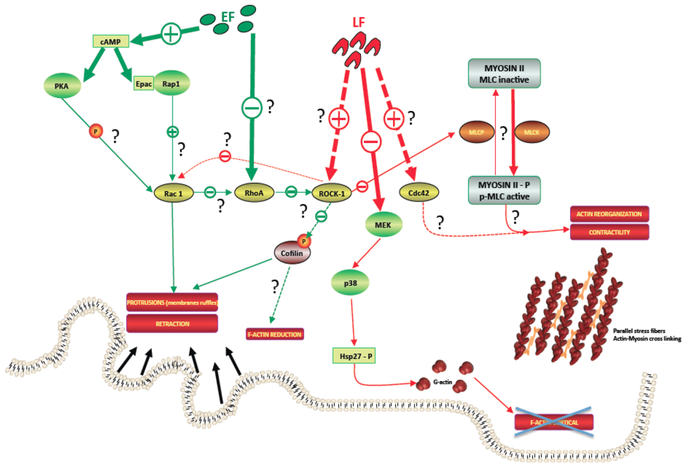 Effects of anthrax lethal and edema factors on cytoskeleton regulatory pathways.This hypothetical figure describes anthrax lethal factor (LF, red) and edema factor (EF, green) main targets along the regulatory pathways of cytoskeleton. On the one hand, LF probably activates Cdc42 and/or ROCK. ROCK activation could increase Myosin Light Chain (MLC) phosphorylation, leading to cell contractility. In parallel, LF-Mitogen-Activated Protein Kinase (MEK) cleavage blocks the Hsp27 phosphorylation cycle, impairing actin monomer transport to an area of new actin filament assembly. On the other hand, EF increases the cAMP level which signals via PKA and/or Epac/Rap1, potentially leading to the activation of Rac1 and inducing protrusions and retraction of the membrane. In parallel, EF could inhibit RhoA, leading to a reduction of F-actin via cofilin activation.