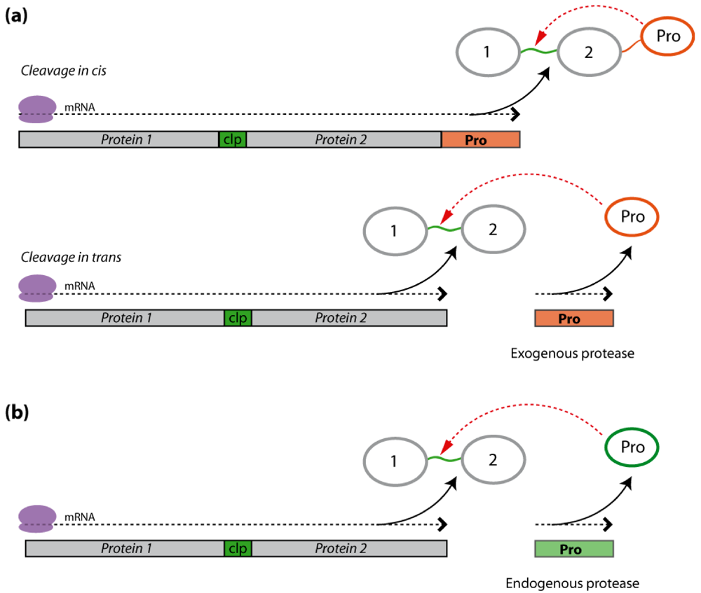 One possible way to avoid such trade-offs is to express polyprotein precursors with cleavable linkers between the proteins of interest. This approach is based on the gene/protein expression strategy adopted by some viruses to ensure a quantitative balance of protein components in vivo [106]. The protein expression pattern of these viruses first involves the synthesis of a large polypeptide precursor, which is then processed to release the mature proteins [107,108]. Recombinant polyproteins may be engineered to include the coding sequences of multiple proteins separated by accessory DNA sequences encoding a proteolysis-susceptible peptide for processing by either host endogenous proteases or an exogenously supplied recombinant protease (Figure 1).