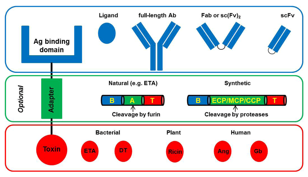 Classically, IT are comprised of a binding domain and a toxic domain, which optionally can be separated by an adapter peptide. The binding domain can be either a ligand (e.g., growth factor) or an antibody or a derivative thereof (e.g., scFv, Fab). The optional adapter peptide is used to improve translocation efficiency from the endosome into the cytosol. Naturally occurring adapter sequences can be derived from Pseudomonas Exotoxin A (ETA), which is composed of a binding domain (B), a translocation domain (A), and a toxic domain (T). Also, synthetic adapters containing an endosomal cleavable peptide (ECP), a membrane transfer peptide (MTP), and a cytosolic cleavable peptide (CCP) can be engineered. For cytotoxicity, bacteria-derived toxins (e.g., ETA, Diphtheria Toxin (DT)), plant-derived toxins (e.g., Ricin), or human enzymes (e.g., Granzyme B (Gb), Angiogenin (Ang)) can be used.