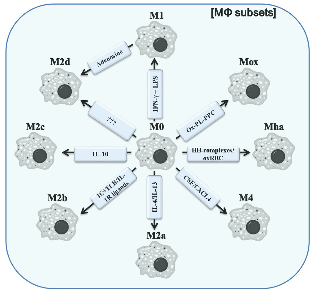 Different polarized MΦ subsets. Abbreviations: IC, immune complex; TLR, Toll-like receptor; IL-1R, IL-1 receptor; Ox-PL-PPC, ox-PL 1-palmitoyl-2arachidonoyl-sn-glycero-3-phosphorylcholine; HH-complexes, hapto-hemoglobin; oxRBC, oxidized red blood cells; CSF, colony stimulating factor; CXCL4, chemokine (C-X-C motif) ligand 4.