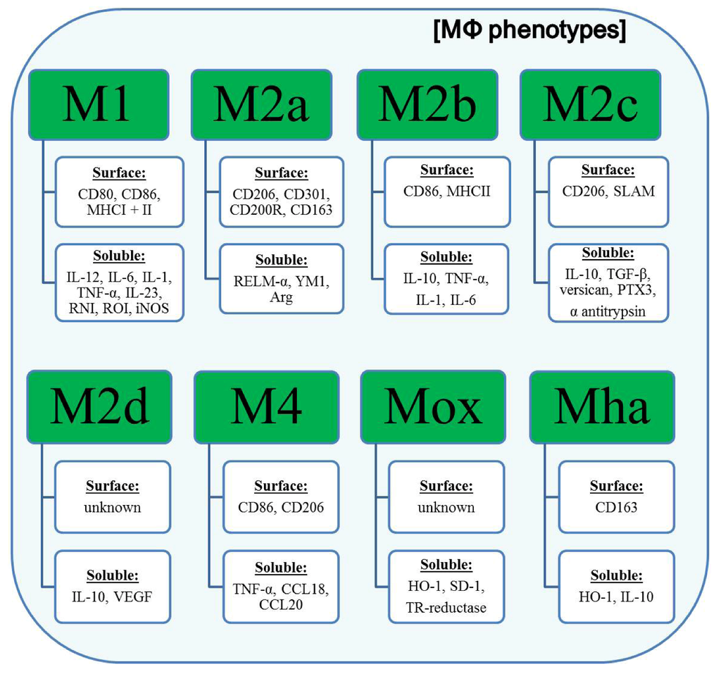 In the context of atherosclerosis, a population of macrophages expressing a unique set of genes including Heme oxygenase-1 (HO-1), sufiredoxin-1, and thioredoxin-reductase in a nuclear factor, erythroid-derived 2, like 2(Nrf2) dependent manner was found within the aortas of 30 week western diet-fed Ldlr−/− mice by immunohistochemistry and flow cytometry. In vitro, this phenotype could be induced by ox-PL 1-palmitoyl- 2arachidonoyl-sn-glycero-3-phosphorylcholine resulting in the designation as Mox macrophages []. Furthermore, Mox macrophages seem to be closely related to the lately proposed hemorrhage-associated macrophages (Mha) [,]. Human monocytes can be differentiated to Mha macrophages in vitro using hapto-hemoglobin complexes or oxidized red blood cells leading to the up-regulation of CD163, HO-1 and IL-10 in an Nrf2-dependent manner. Moreover, a CSF/CXCL4-dependent macrophage subset, discovered in 2010 by Gleissner et al. [], was termed M4. These macrophages were shown to be characterized by a mixed, but unique profile of transcripts including higher levels of CD86 and TNF-α (both M1-like), CD206, CCL18 and CCL20 (all M2-like) and lower levels of pentraxin 3 (PTX3), CD36 and IL-10 (M2-like). Although these cells have a weak phagocytic activity, the function of M4 macrophages remains poorly understood. Finally, the laboratory of Samuel Joseph Leibovich has characterized one further M2 subtype, termed M2d, which unlike previously described M2-like macrophages, are the result of a switching event from M1 macrophages as response to adenosine A2A receptor signaling induced by TLR agonists []. M2d macrophages were demonstrated to markedly decrease the expression of pro-inflammatory cytokines including IL-12 and TNF-α, while concurrently producing high levels of IL-10 and vascular endothelial growth factor (VEGF). Interestingly, the classical markers of wound healing or M2a macrophages were not up-regulated pointing to an M2c-resembling phenotype of M2d macrophages. The phenotypes of different polarized macrophages are summarized in Figure 3.