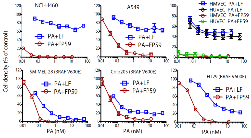 PA + FP59 is much more toxic than LT (PA + LF) to cells. Sensitivities of NCI-H460 cells, A549 cells, human umbilical vascular endothelial cells (HUVEC), human microvascular endothelial cells (HMVEC), SM-MEK-28 cells, Colo205 cells, and HT29 cells to PA/FP59 and LT are shown. Cells cultured in 96-well plates were treated with various concentrations of PA (0–12 nM) + 1.9 nM FP59 or various concentrations of PA (0–60 nM) + 6 nM LF for 48 h. Cell viability was evaluated by MTT assay. Untreated cells were used as a reference to calculate percent survival. The bottom three panels are the cells with the BRAF V600E mutation. Data are reported as mean viability ± S.D.