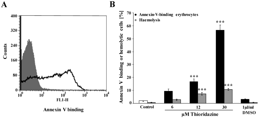 The present study explored whether thioridazine triggers eryptosis, the suicidal death of erythrocytes. The key hallmark of eryptosis is the triggering of cell membrane scrambling with increase of phosphatidylserine abundance at the cell surface. Accordingly, phosphatidylserine exposing erythrocytes were identified by annexin-V-binding in flow cytometry. As shown in Figure 1, treatment of human erythrocytes from healthy individuals with thioridazine increased the percentage of annexin-V-binding erythrocytes, an effect reaching statistical significance at 12 µM thioridazine concentration (Figure 1A,B). In order to explore whether thioridazine treatment may trigger hemolysis, the percentage of hemolysed erythrocytes was estimated from the hemoglobin concentration in the supernatant. As illustrated in Figure 1B, thioridazine treatment significantly increased the hemoglobin concentration in the supernatant. The percentage of hemolytic erythrocytes was, however, clearly smaller than the percentage of annexin V binding erythrocytes (Figure 1B).
