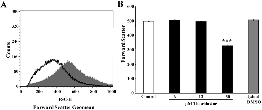 Effect of thioridazine on erythrocyte forward scatter. (A) Original histogram of forward scatter of erythrocytes following exposure for 48 h to Ringer solution without (grey shadow) and with (black line) presence of 30 µM thioridazine; (B) Arithmetic means ± SEM (n = 6) of the normalized erythrocyte forward scatter (FSC) following incubation for 48 h to Ringer solution without (white bar) or with (black bars) thioridazine (6–30 µM); *** (p < 0.001) indicates significant difference from the absence of thioridazine (ANOVA).