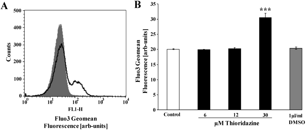 Effect of thioridazine on erythrocyte cytosolic Ca2+ concentration. (A) Original histogram of Fluo3 fluorescence in erythrocytes following exposure for 48 h to Ringer solution without (grey shadow) and with (black line) presence of 30 µM thioridazine; (B) Arithmetic means ± SEM (n = 6) of the Fluo3 fluorescence (arbitrary units) in erythrocytes exposed for 48 h to Ringer solution without (white bar) or with (black bars) thioridazine (6–30 µM); *** (p < 0.001) indicates significant difference from the absence of thioridazine (ANOVA).