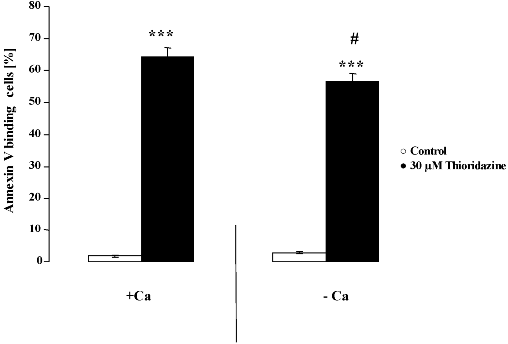Effect of Ca2+ withdrawal on thioridazine induced annexin-V-binding.Arithmetic means ± SEM (n = 7) of the percentage of annexin-V-binding erythrocytes after a 48 h treatment with Ringer solution without (white bars) or with (black bars) 30 µM thioridazine in the presence (left bars, +Ca) and absence (right bars, −Ca) of calcium. *** (p < 0.001) indicates significant difference from the absence of thioridazine (ANOVA); # (p < 0.05) indicates significant difference from the respective values in the presence of Ca2+ (ANOVA).