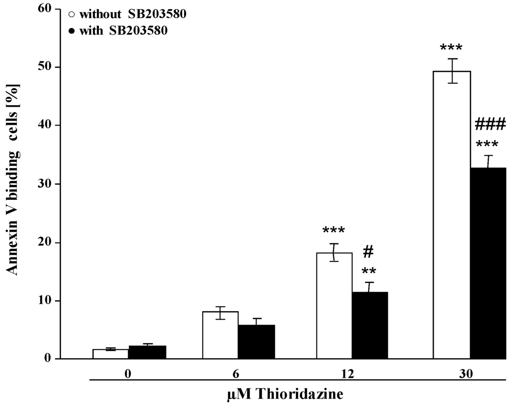 Effect of thioridazine on phosphatidylserine exposure in the presence or absence of p38 kinase inhibitor SB203580. Arithmetic means ± SEM (n = 6) of erythrocyte annexin-V-binding following incubation for 48 h to Ringer solution without or with presence of thioridazine (6–30 µM) in the absence (white bars) or presence (black bars) of 2 µM SB203580. ** (p < 0.01); *** (p < 0.001) indicate significant differences from the absence of thioridazine (ANOVA); # (p < 0.05); ### (p < 0.001) indicate significant differences from the absence of SB203580 (ANOVA).