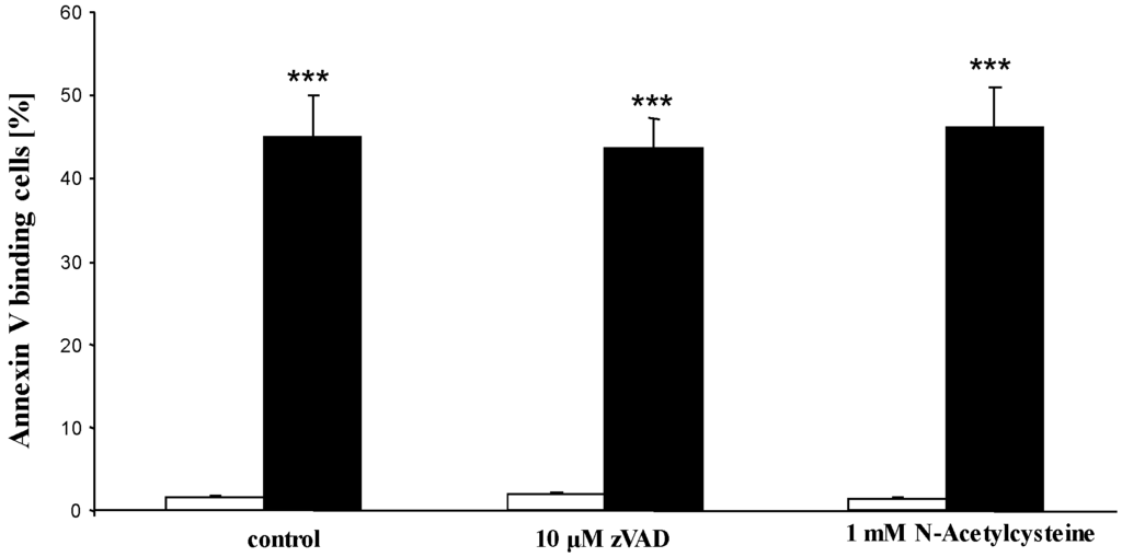 Additional experiments were performed in the absence and presence of pancaspase inhibitor zVAD (10 µM). As illustrated in Figure 6, a 48 h exposure to thioridazine (30 µM) increased the percentage of annexin V binding erythrocytes to a similar value in the presence and absence of zVAD. Further experiments were performed in the absence and presence of antioxidant N-acetyl-cysteine (1 mM). As a result, a 48 h exposure to thioridazine (30 µM) increased the percentage of annexin V binding erythrocytes again to a similar value in the presence and absence of N-acetyl-cysteine.