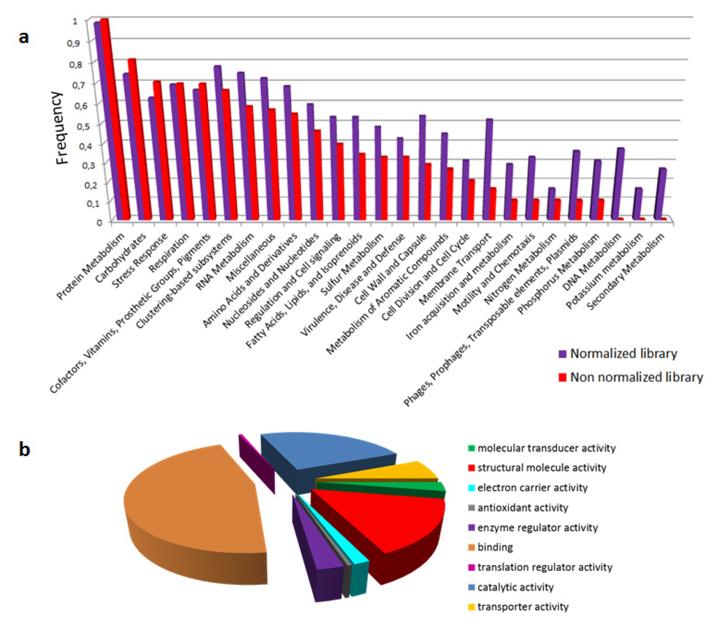 Functional annotation of Atractaspis transcriptomes. (a) Differences of subsystem’s annotation of reads between Normalized and Non-Normalized libraries. (b) Gene Ontology classification of reads covering 80% of assembled contigs (Non-Normalized library).