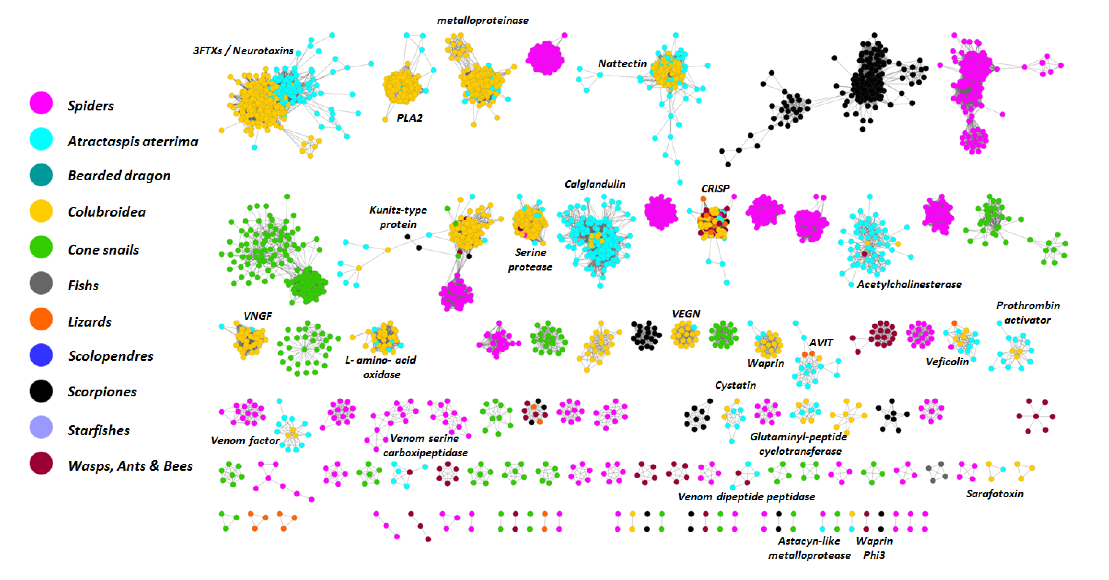 Network based annotation of toxins illustrating the diversity of previously characterized toxins in the venom cocktail is represented in Figure 2.