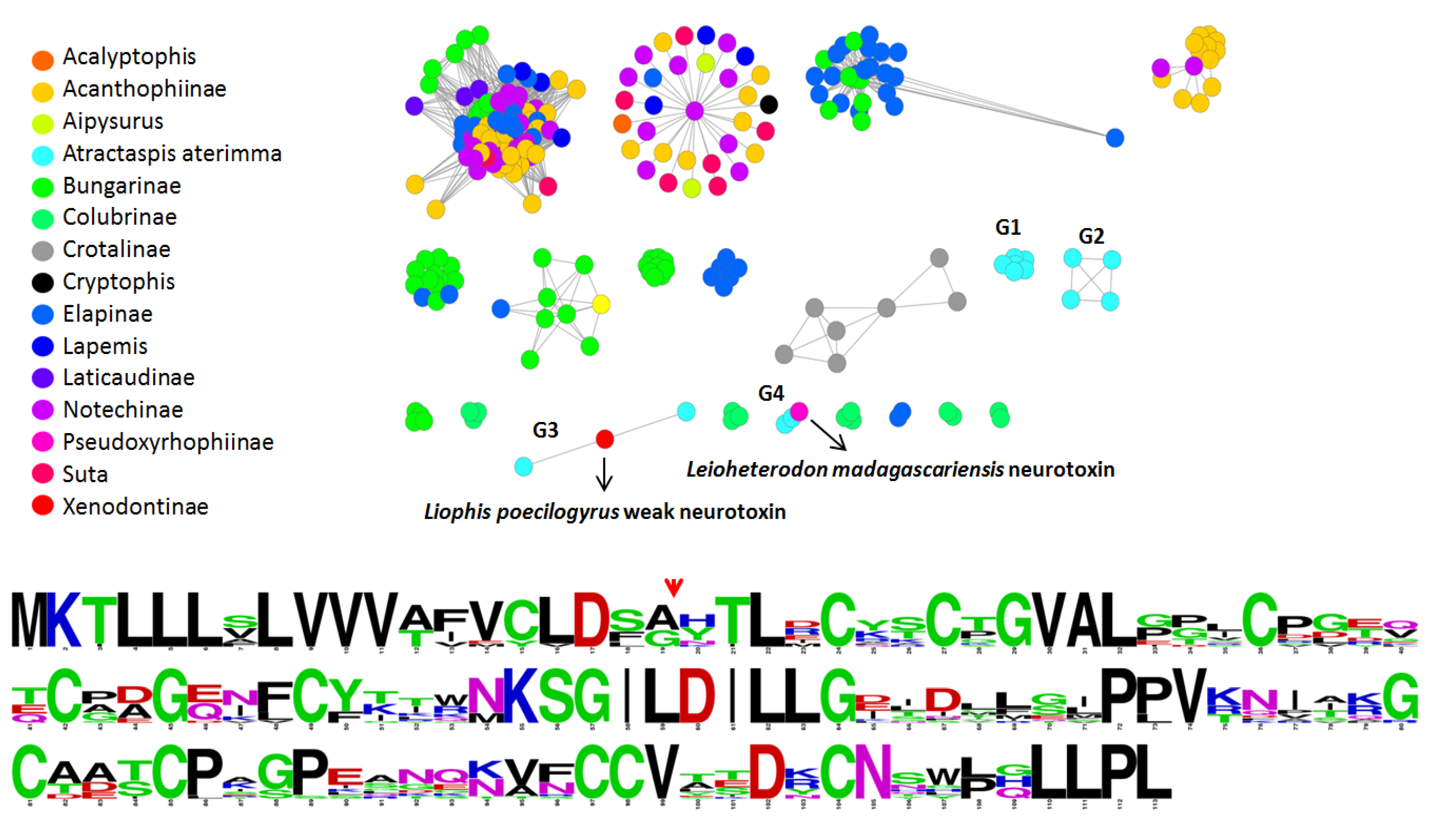Consistent with the phylogeny, the network analyses at a 1E−20 e-value threshold split the A. aterrima 3FTxs into four different groups (G1 to G4). One of the isoforms is not associated with any groups at this e-value threshold and is consequently classified as a singleton and does not appear in the graphical representation. It is noteworthy that none of the A. aterrima isoforms were found in any of the larger 3FTx groups.