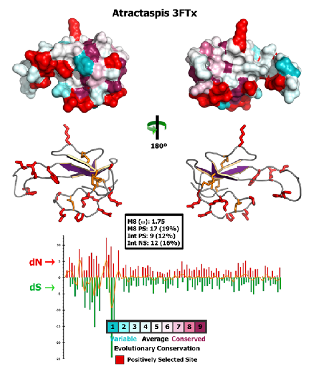 Three-dimensional homology model of Atractaspis 3FTx, depicting the locations of positively selected sites (shown in red) detected by site-model 8. The omega value and the number of positively selected sites (Model 8, PP ≥ 0.95, depicting the locations of poach) are also indicated.
