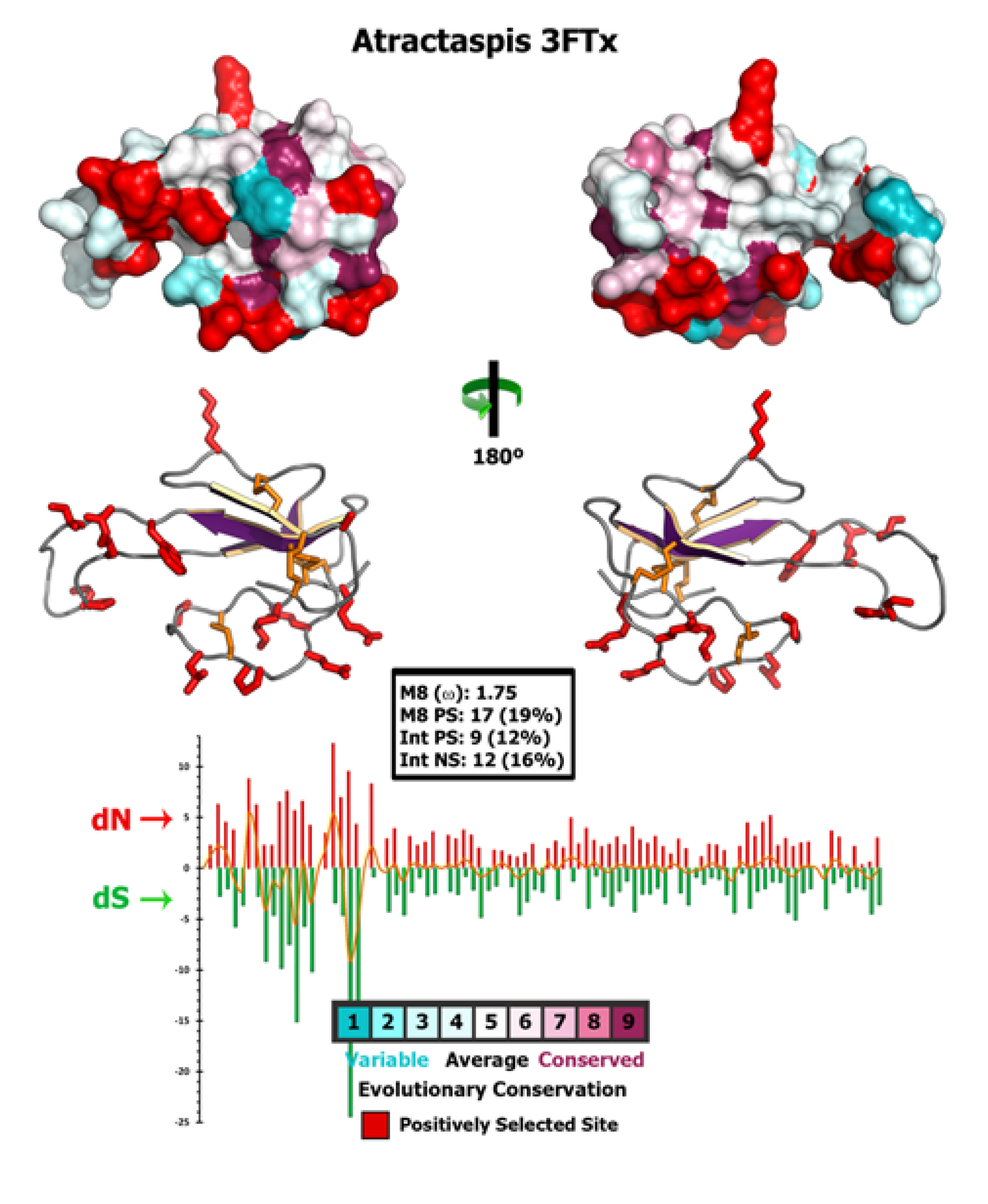 To depict the influence of natural selection pressures on the evolution of Atractaspis 3FTx, we mapped the sites under positive selection on the homology model created using Phyre 2 webserver [42]. Pymol 1.3 [43] was used to visualize and generate the images of homology models. Consurf webserver [44] was used for mapping the evolutionary selection pressures on the three-dimensional homology models.