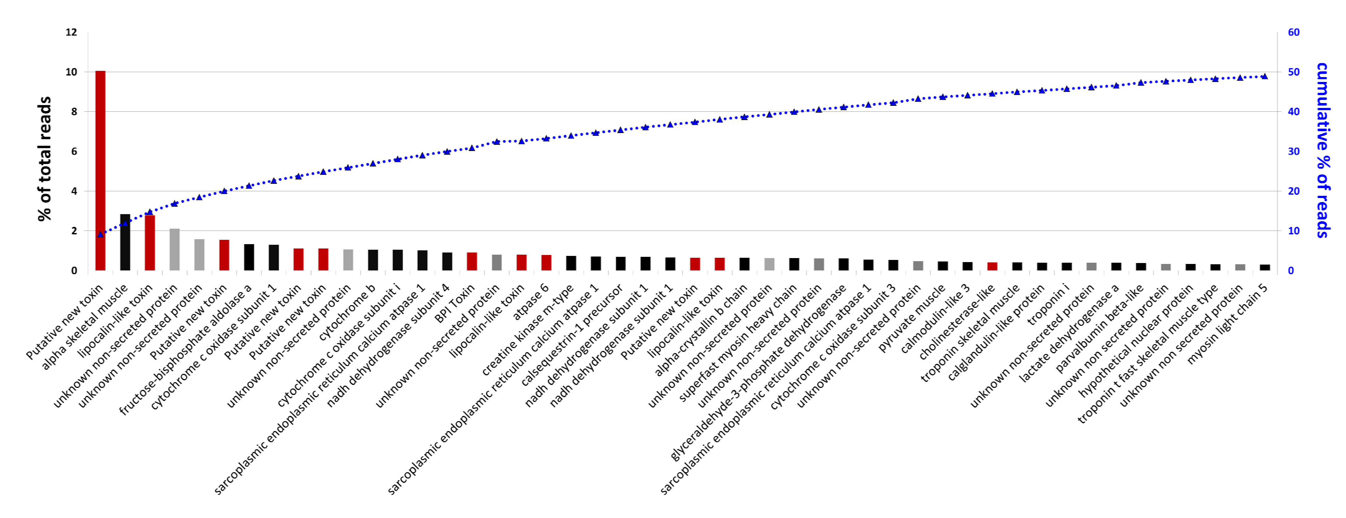 We focused our attention on the 57 most abundant gene transcripts (Figure 5), constituting more than 50% of reads.