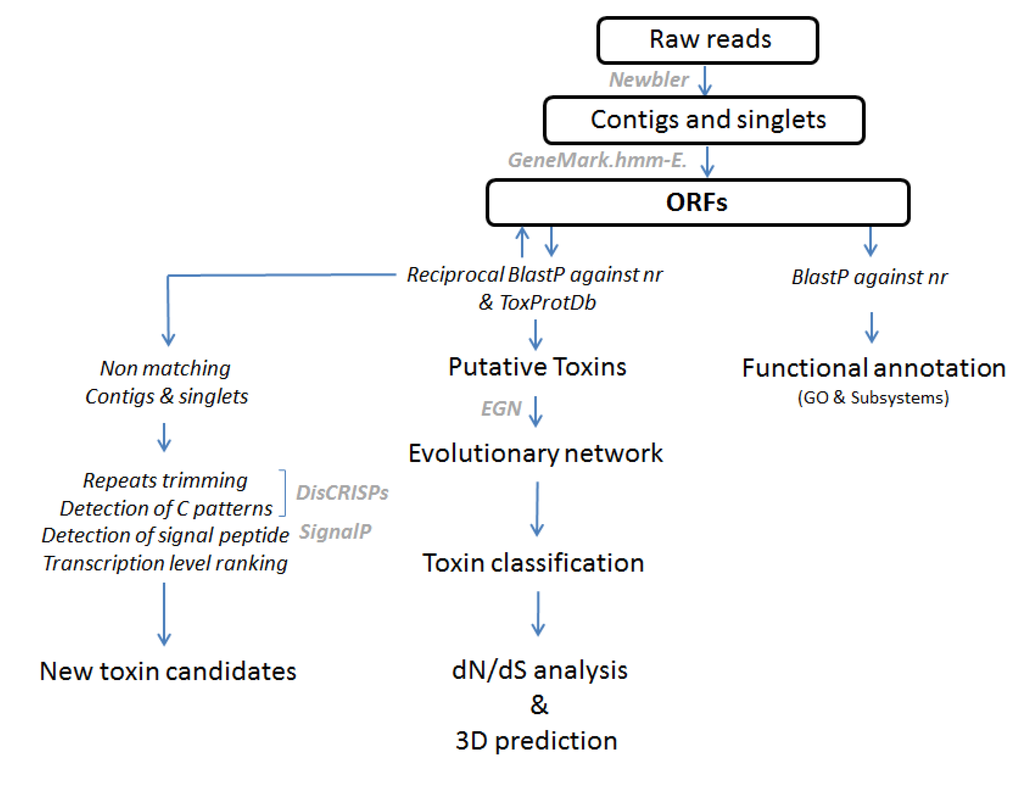 Several studies have shown that transcriptomes include a large number of uncharacterized sequences whose function is still unknown. These sequences can cover several categories of transcripts including mainly non-coding RNAs [20]. We were particularly interested in the presence of transcripts which do not show strong similarities (e-value threshold set to 1E-05) with proteins or sequences already identified. For this, we combined the use of homemade software, which analyzes BLAST results, Signal P outputs and an optional detection of cysteine patterns. In the case of a venom gland, the detection of a transcript corresponding to a secreted protein suggests that the protein is most likely a toxin as the common core of the vertebrate genome is relatively well characterized. We completed these initial criterions by using the transcript levels associated with each of the new candidates to select the most relevant ones. The general EST processing workflow is described in detail in Figure 6.