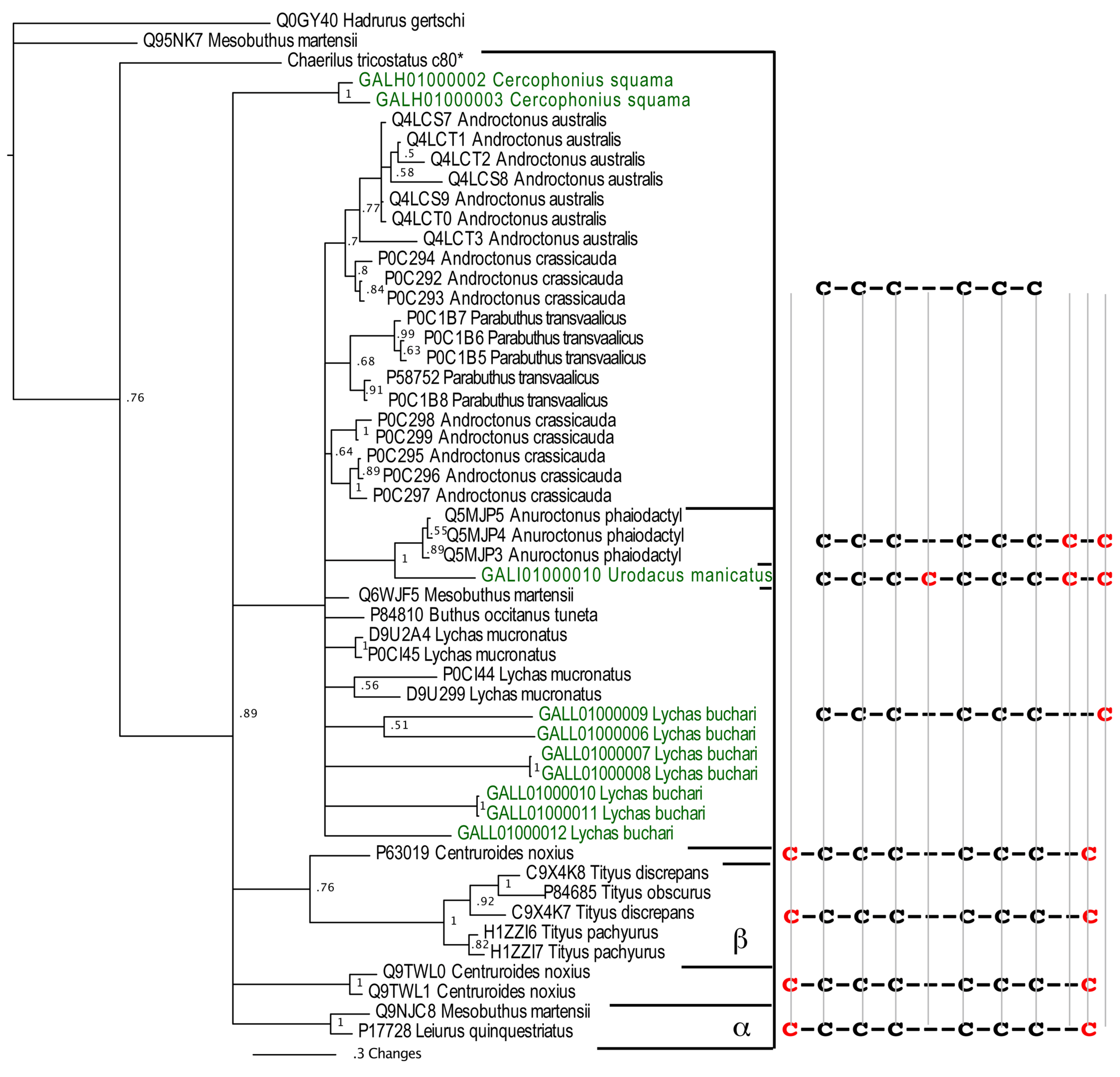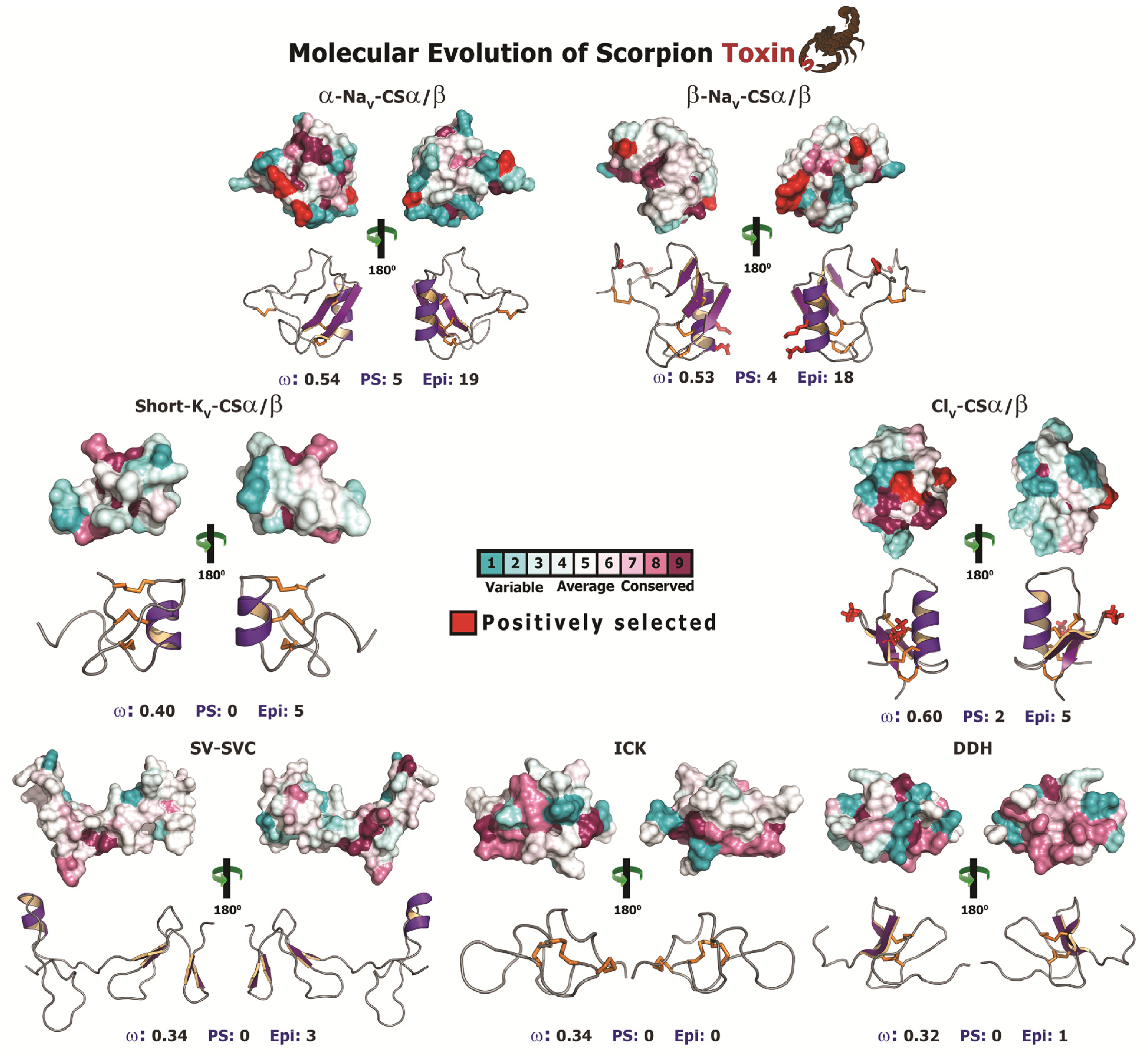 - Tian, C.; Yuan, Y.; Zhu, S. Positively selected sites of scorpion depressant toxins: possible roles in toxin functional divergence. Toxicon 2008, 51, 555–562. [Google Scholar] [CrossRef]