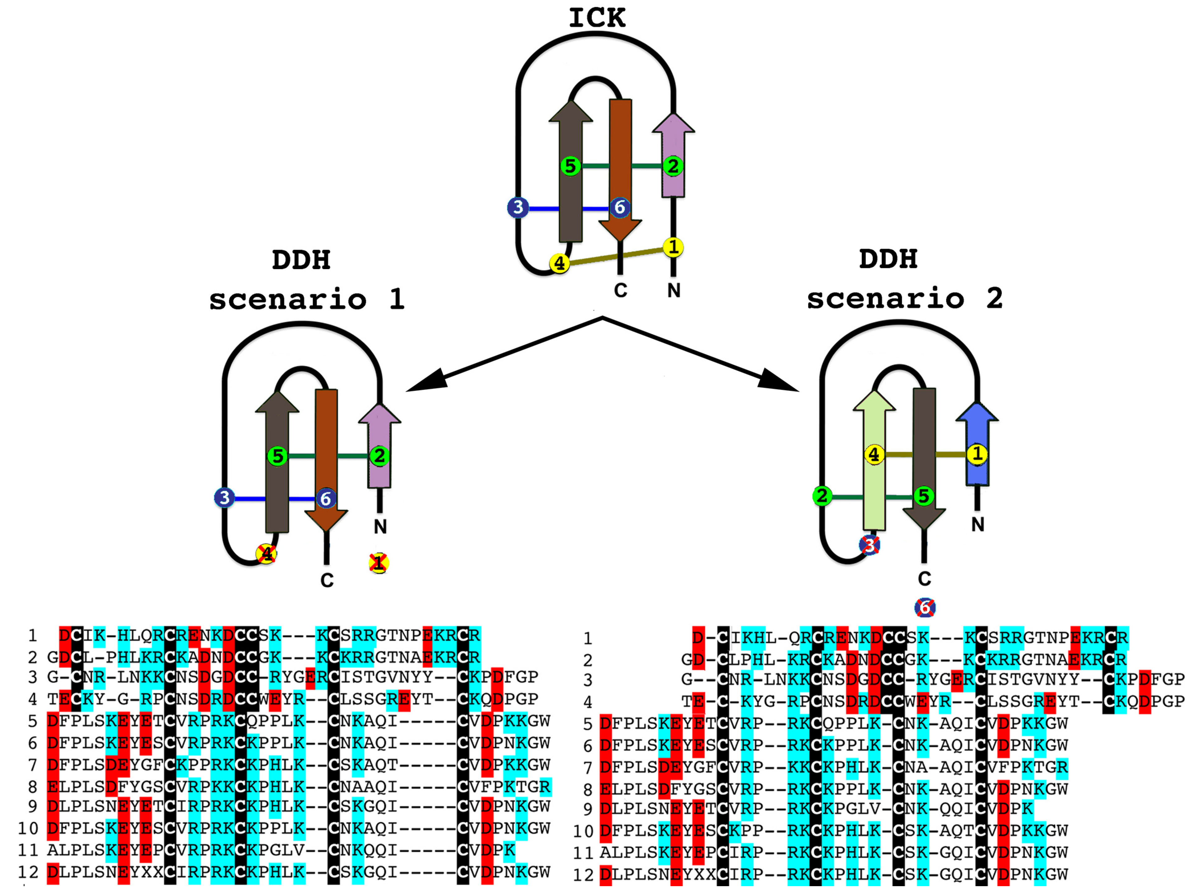 Of the shared cysteines, it has been previously proposed that they differ by the relative presence of the first and fourth of the ICK cysteines [63,64,65] (scenario 1 in Figure 2 and Figure 3). However, we propose an alternate scenario that the DDH and ICK differ by the relative presence of the third and sixth ICK cysteine (scenario 2 in Figure 2 and Figure 3). This scenario is more consistent in regards to the relative presence of charged resides. It should be noted, that it does not affect the relative structure of DDH toxins, but merely proposes an alternate evolutionary history of the cysteines shared between the DDH and ICK in regards to which ICK cysteines were deleted in the derivation to the DDH form.