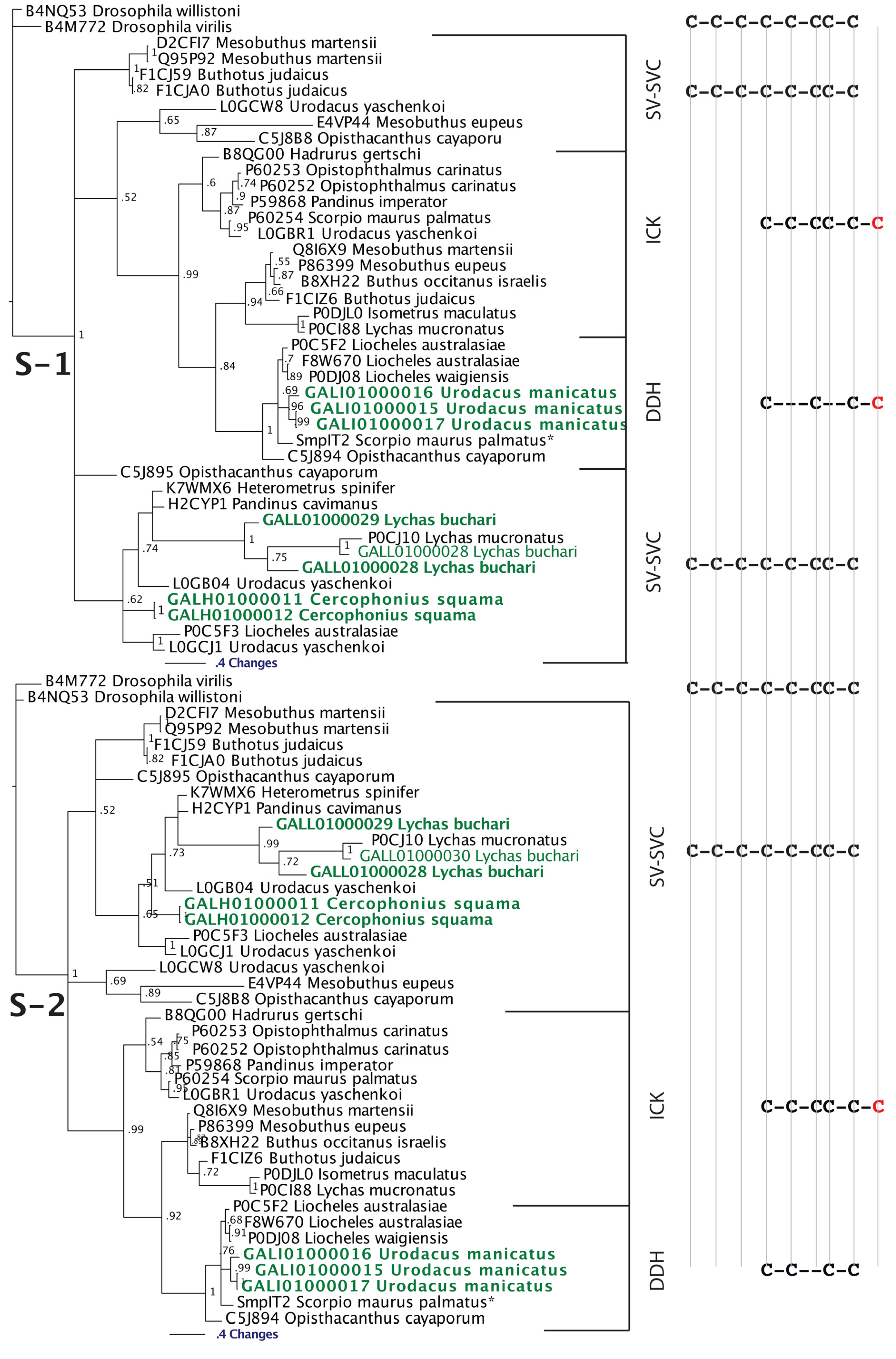 Our Bayesian molecular phylogenetic reconstructions investigated the link between SV-SVC peptides (scorpion venom single von Willebrand factor C-domain peptides) and the DDH and ICK peptides. The results of our phylogenetic reconstructions and sequence alignments clearly highlight the evolutionary origin of DDH and ICK sequences from the SV-SVC peptides (Figure 2 and Figure 3). Regardless of the alignment variance (full alignments of the two alternative scenarios can be found in the supplementary material), the DDH come out as derivatives of the ICK and the DDH/ICK clade is nested within the SV-SVC clade. The SV-SVC as the plesiotypic state for this entire clade is supported by this cysteine framework being widely distributed within arthropods [47], in comparison to the conspicuous absence of likely ancestral non-toxin arthropod forms of the ICK or DDH motifs. Hence, we rooted our tree using related arthropod non-toxin sequences that have been shown to be homologues of the SV-SVC [47]. It is noteworthy that SV-SVC have been retrieved from both buthid and non-buthid scorpion lineages, which is consistent with our single early evolution hypothesis. Similarly the SV-SVC apotypic forms (ICK and DDH) have been retrieved from both buthid and non-buthid venoms, indicative of their derivation occurring before the buthid split at the base of the scorpion evolution tree. While the DDH peptides have been proposed to be the plesiotypic state, with the ICK as an apotypic state [63], our results instead indicate that the DDH are actually a highly apotypic condition, phylogenetically nested within the ICK peptides, with the SV-SVC being the plesiotypic state and, as would be expected, are non-monophyletic relative to the DDH/ICK (Figure 2). The differences in cysteine pattern can be interpreted as a stepwise loss due to domain-deletions (Figure 3), which is consistent with the mapping of the known activities.