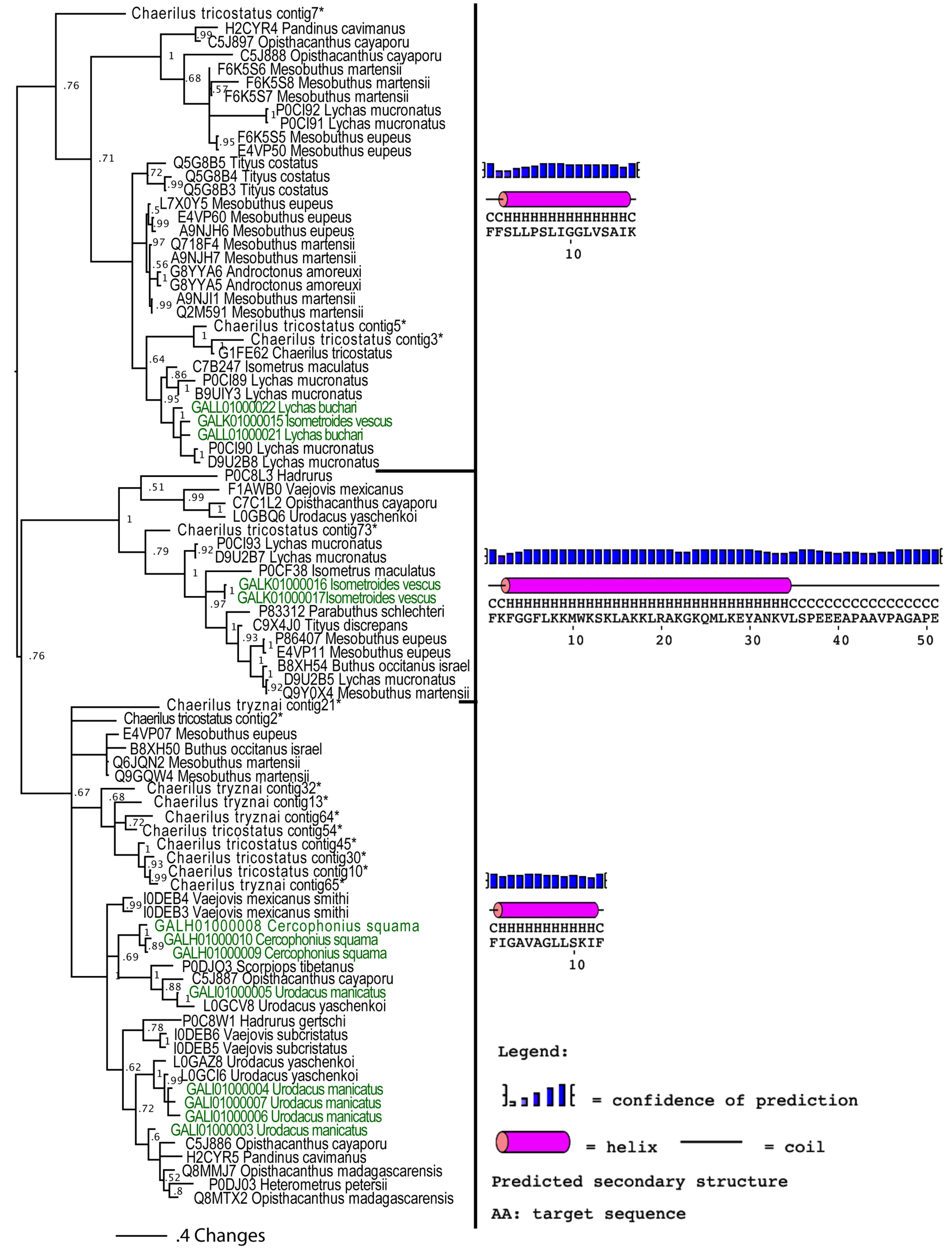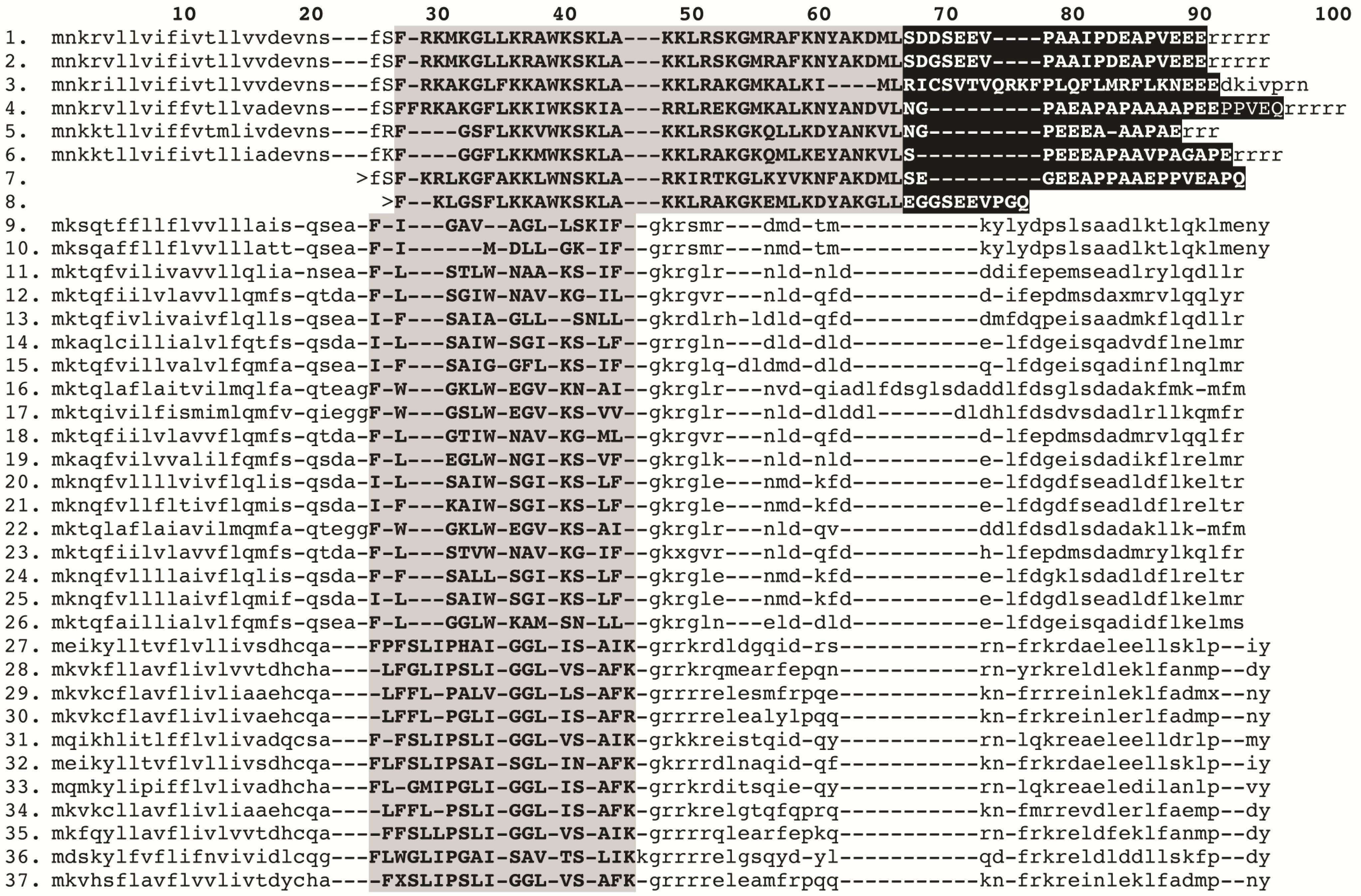 Sequence alignment of cytotoxic linear peptides: (1). GALK01000016 Isometroides vescus; (2). GALK01000016 Isometroides vescus; (3). GALL01000023 Lychas buchari; (4). D9U2B7 Lychas mucronatus; (5). Q9Y0X4 Mesobuthus martensii; (6). C9X4J0 Tityus discrepans; (7). P0CF38 Isometrus maculatus; (8). P83312 Parabuthus schlechteri; (9). Q9GQW4 Mesobuthus martensii; (10). B8XH50 Buthus occitanus israelii; (11). I0DEB4 Vaejovis mexicanus smithii; (12). GALH01000010 Cercophonius squama; (13). P0C8W1 Hadrurus gertschi; (14). C5J886 Opisthacanthus cayaporum; (15). P0DJ03 Heterometrus petersii; (16). L0GCV8 Urodacus yaschenkoi; (17). P0DJO3 Scorpiops tibetanus; (18). GALH01000009 Cercophonius squama; (19). GALI01000003 Urodacus manicatus; (20). GALI01000004 Urodacus manicatus; (21). GALI01000007 Urodacus manicatus; (22). GALI01000005 Urodacus manicatus; (23). GALH01000008 Cercophonius squama; (24). GALI01000006 Urodacus manicatus; (25). L0GCI6 Urodacus yaschenkoi; (26). H2CYR5 Pandinus cavimanus; (27). G8YYA6 Androctonus amoreuxi; (28). B9UIY3 Lychas mucronatus; (29). GALL01000021 Lychas buchari; (30). GALK01000015 Isometroides vescus; (31). Q5G8B3 Tityus costatus; (32). E4VP60 Mesobuthus eupeus; (33). Q5G8B5 Tityus costatus; (34). D9U2B8 Lychas mucronatus; (35). C7B247 Isometrus maculatus; (36). G1FE62 Chaerilus tricostatus; (37). GALL01000022 Lychas buchari. Signal peptide and C-terminal cleaved propeptides are shown in lowercase. BPP domain shown in black and the cytotoxic posttranslationally processed peptide is highlighted in gray. ‘>’ indicates incomplete sequence.