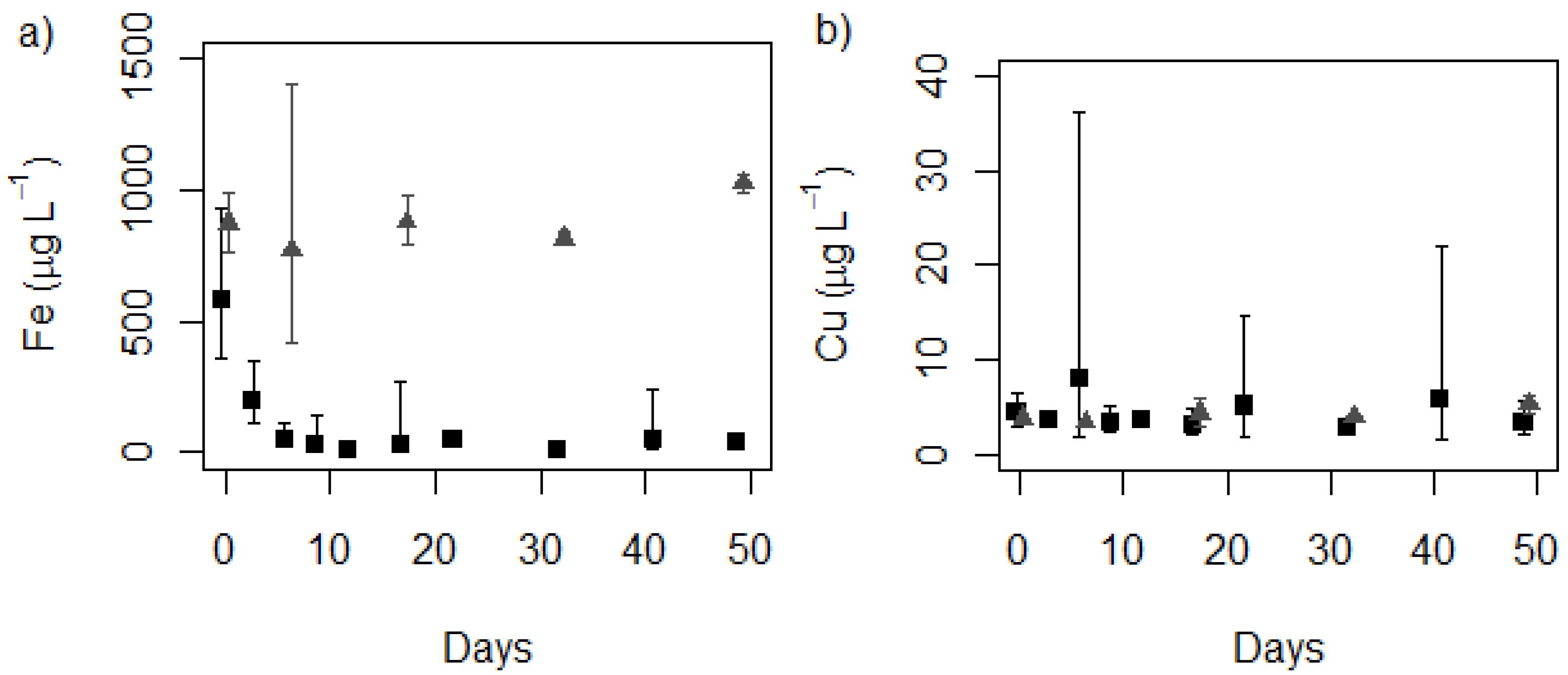 The control data confirm that iron was not removed from the culture medium via sorption to the container walls, but that the decreases were due to biological factors. Strain CYN52 was unialgal but non-axenic, making it likely that this decrease is attributed to metal interactions with the P. autumnale strain and associated bacteria and viruses. Even low quantities of bacteria can accelerate iron removal from liquid cultures [30].