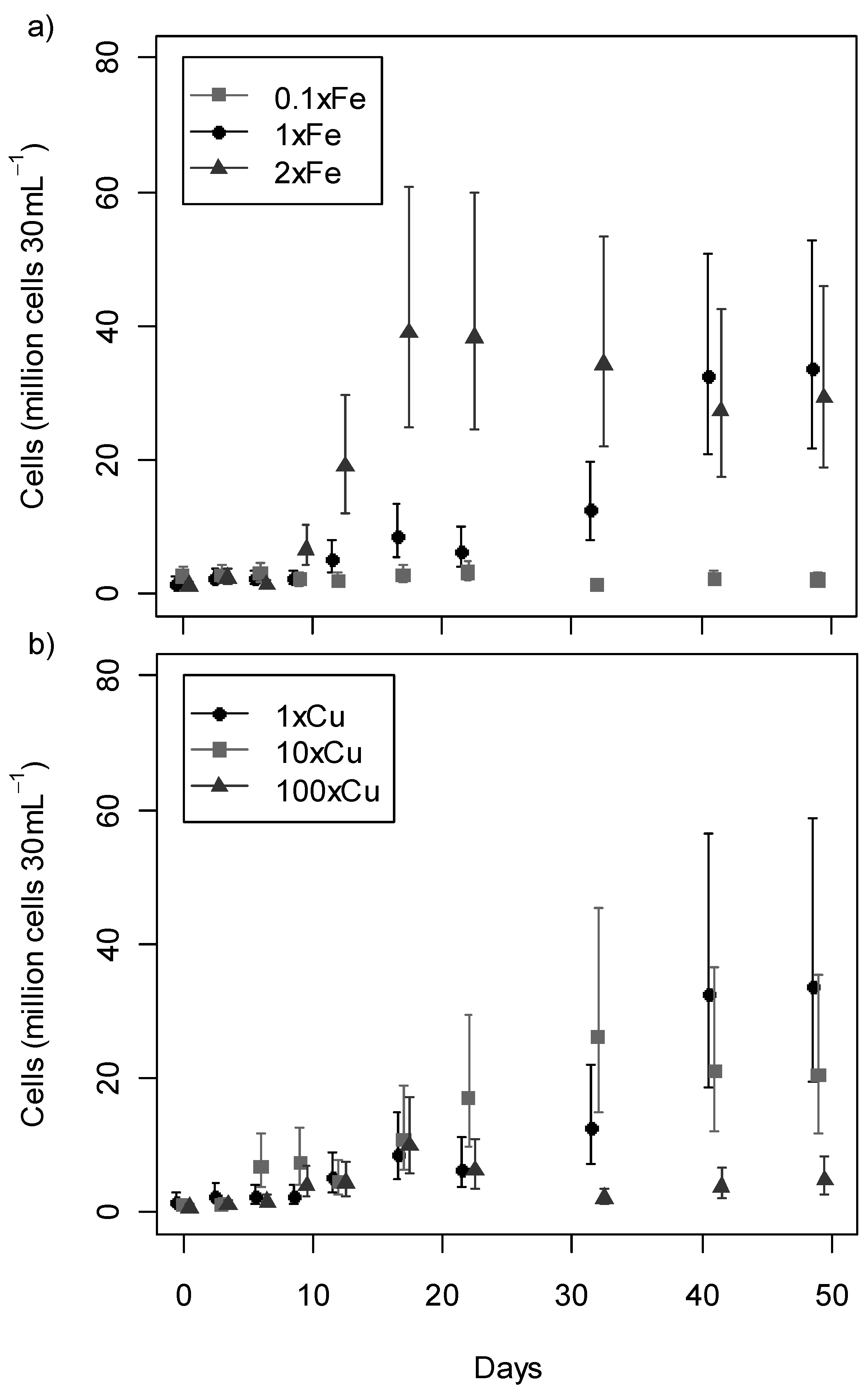 Growth profile for Phormidium autumnale (CYN52) under (a) iron (Fe) and (b) copper (Cu) regimes over 49 days. Growth is recorded as mean number of cells per 30 mL culture with 95% confidence intervals (n = 3).