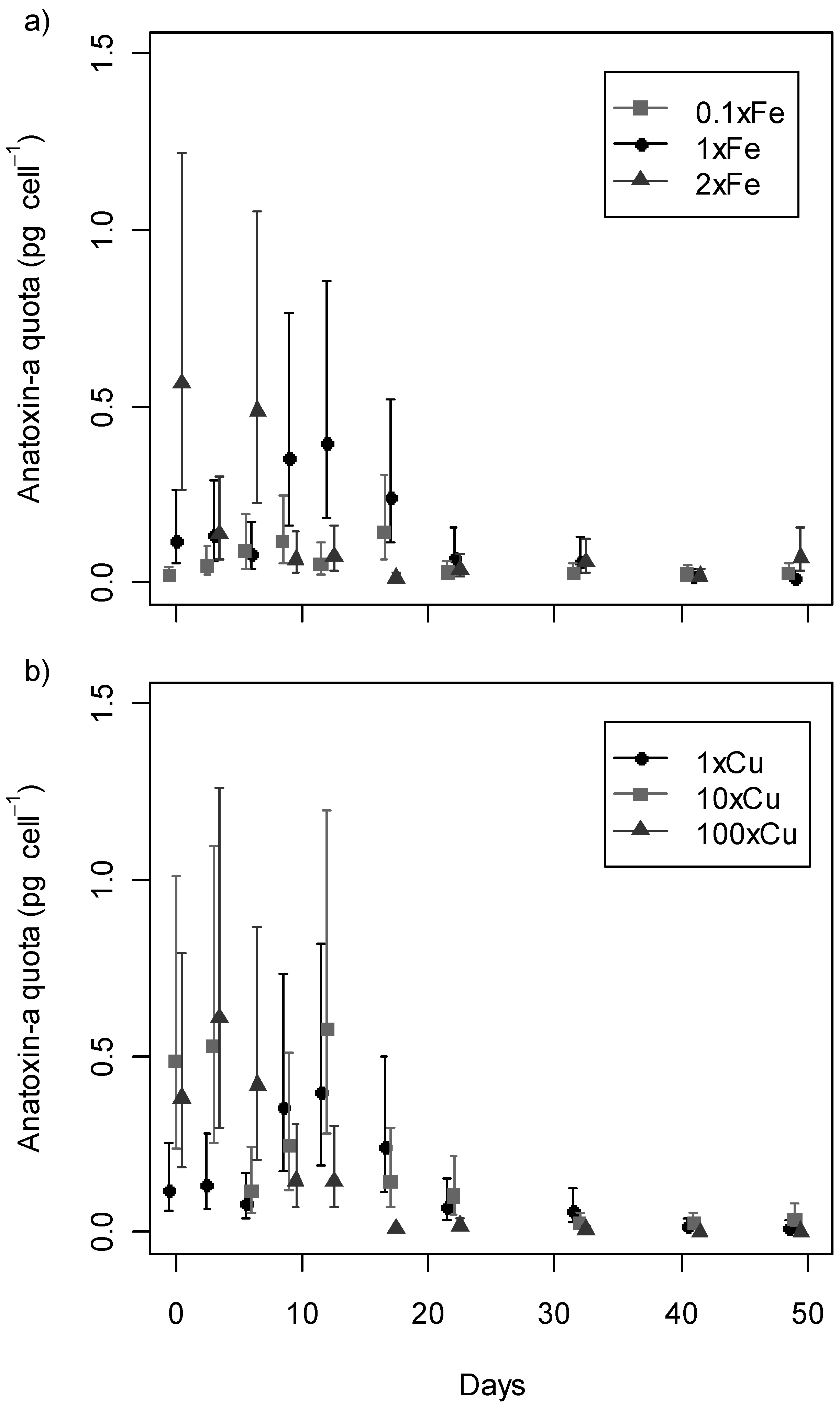 Intracellular anatoxin-a in Phormidium autumnale (CYN52) under (a) iron (Fe) and (b) copper (Cu) regimes. Anatoxin-a quota are recorded as mean concentrations with 95% confidence intervals (n = 3).