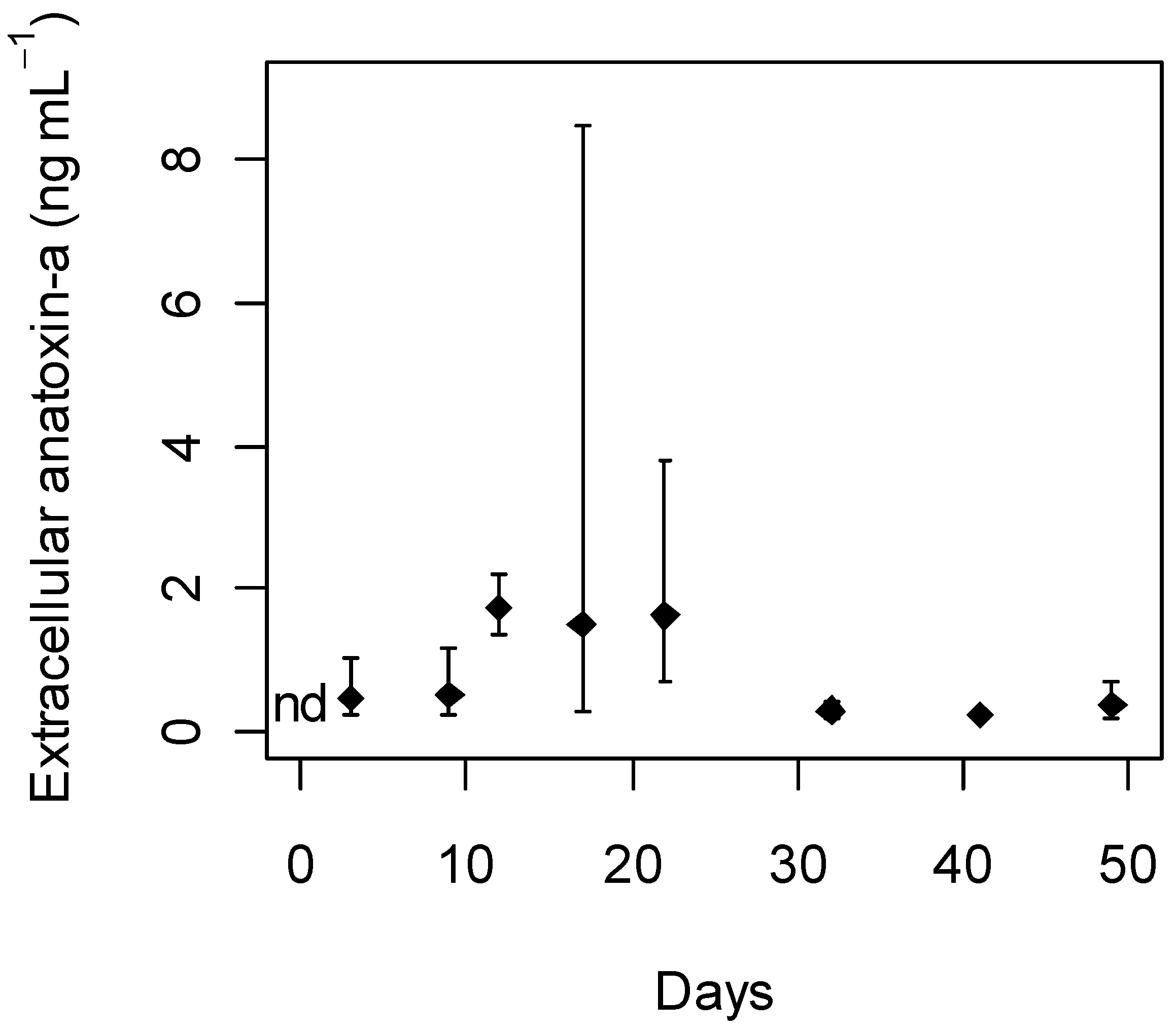 The observed variation in extracellular anatoxin-a concentrations (Figure 4) is not likely to be influenced by iron and copper concentration. Stevens and Krieger [56] observed that photolytic degradation of anatoxin-a occurred on a faster time-scale compared to non-photolytic degradation catalysed by iron or copper. The photolytic degradation occurred within a couple of hours. The non-photolytic degradation occurred over a couple of weeks.