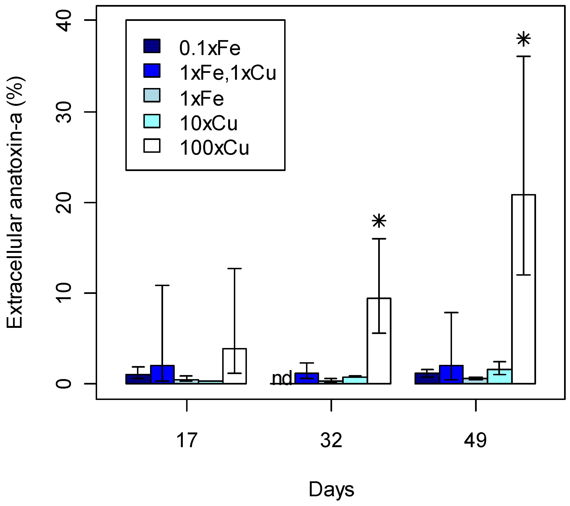 Anatoxin-a is expected to be mostly intracellular under beneficial growth conditions [6]. The highest extracellular anatoxin-a concentrations detected in MLA1×Fe,1×Cu was 2.5 ± 1.9 ng mL−1 recorded on Day 17 (Figure 4). Therefore, the modified MLA treatments were only analysed in the mid-exponential and stationary phase on Day 17, 32, and 49 (Figure 5). Under high copper concentrations (250 μg L−1 Cu), a significantly higher percentage of extracellular anatoxin-a to total anatoxin-a was detected on Day 32 and 49 compared with other treatments. These high anatoxin-a concentrations could be due to cell lysis [6] or deformation of the cell wall by copper [57] allowing anatoxin-a to leak into the surrounding culture medium. Dead trichomes with deformed cell walls were observed on Day 49 for the high copper treatment, supporting the suggestion that anatoxin-a was released through cell lysis. Mass cell-lysis events in other toxic cyanobacteria have caused human poisonings resulting in hospitalisation [58,59] and death [60].