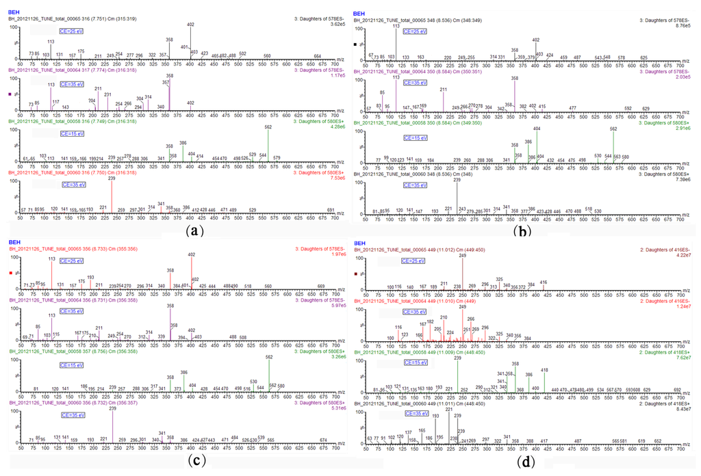 Product ion spectra of Compound 1 (a); Compound 2 (b); Compound 3 (c); and Compound 4 (d) using ultra performance liquid chromatography-tandem mass spectrometry (UPLC-MS/MS).