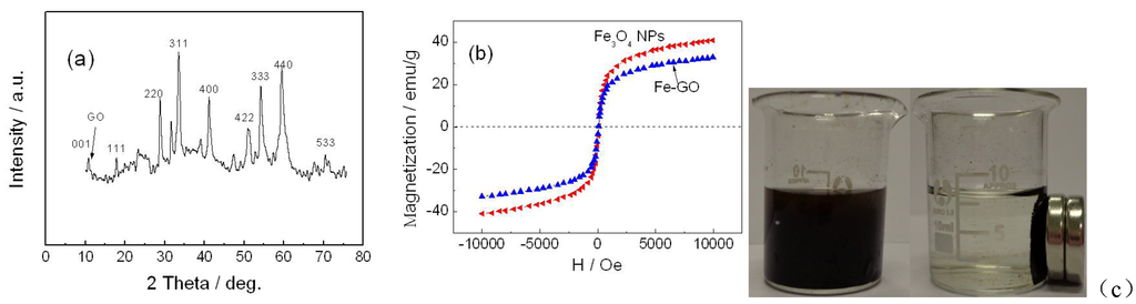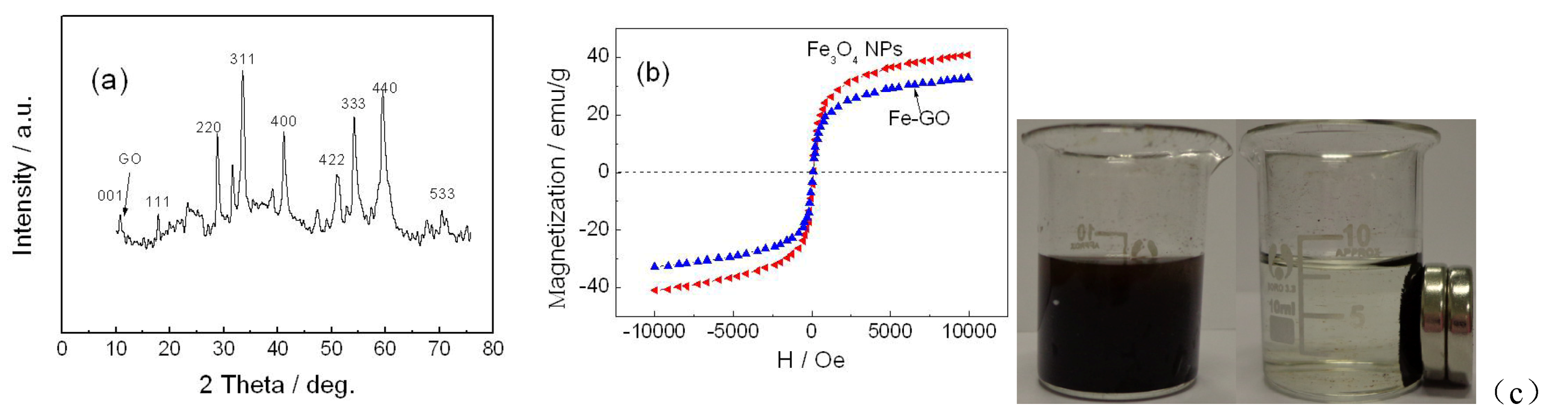The (a) XRD; (b) magnetization hysteresis loops spectrum and (c) magnetic separation of Fe-GO before and after adding the magnetic field.
