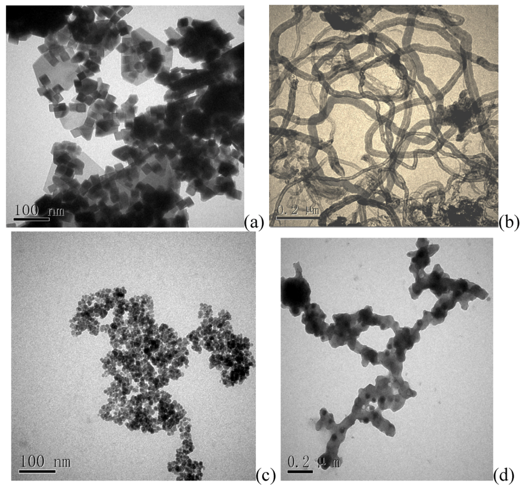 The TEM of (a) Fe-GO; (b) CNT; (c) CdTe QDs and (d) CdTe-CNT nanocomposite.