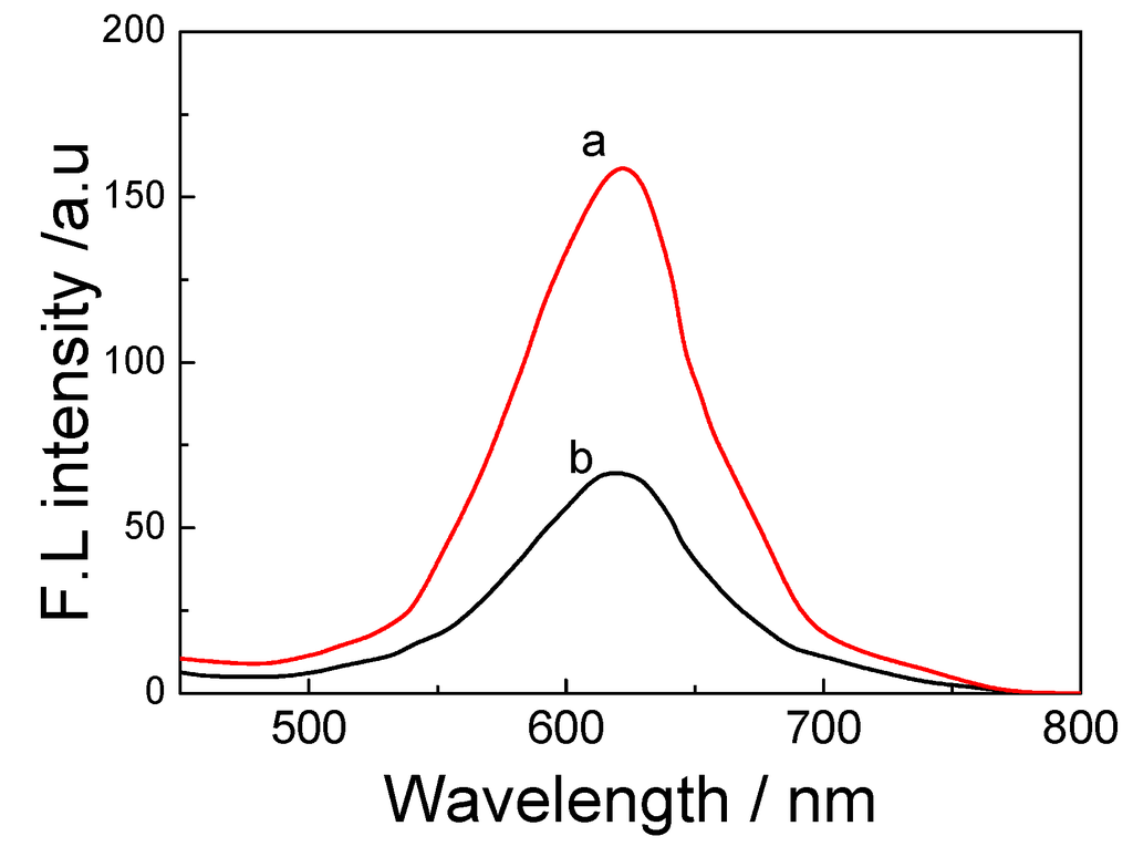 The CdTe-CNT complex consists of covalently bound ingredients, therefore, fluorescence spectroscopy was performed to investigate CNT photo bleaching effects on QDs. The CdTe QDs have a distinct emission spectrum peak at 620 nm (Figure 3, curve a). The –COOH functionalized CNTs alone failed to emit a signal. When CNT was covalently bounded to QDs through the attachment of PDDA, the emission peak at 620 nm reduced (Figure 3, curve b).
