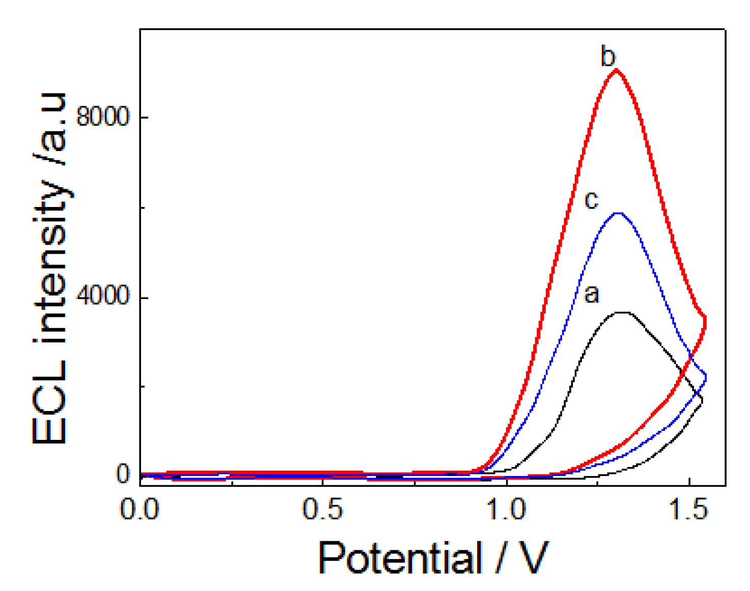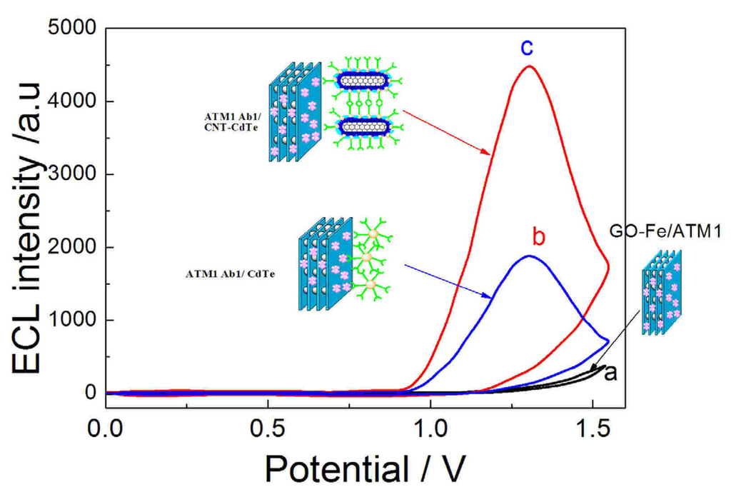 The fabrication process of the ECL immunosensor was monitored by measuring the ECL signals after each immobilization step (Figure 7). It could be seen that there was no ECL signal for Fe-GO after it absorbs the ATM1(curve a), whereas there was an obvious enhancement of ECL intensity after a sandwich immunoreaction between Fe-GO, 5 pg/mL ATM1 and the antibody on the signal tag (ATM1 Ab1/CdTe) (curve b). There was a 2.5-fold enhancements in ECL signal for ATM1 detection by ATM1 Ab1/CdTe-CNT tag (curve c) when comparing with CdTe as the signal tag matrix (curve b). All these imply that the CNT can greatly accelerate the electron transfer between CdTe QDs and SPCE electrode, and then obviously amplify the ECL signal.