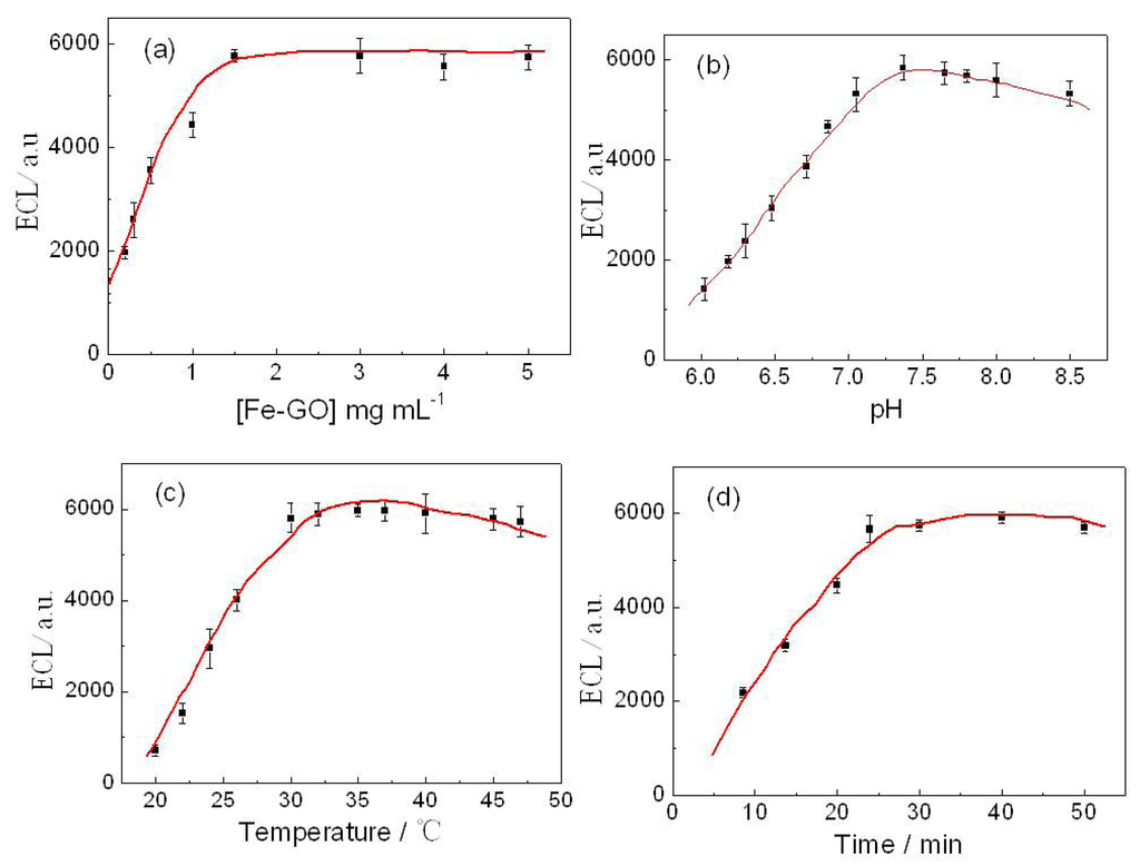 Figure 8 showed the effects of different immunoassay operating factors, such as the amount of the Fe-GO composite solutions absorbed on the electrode (curve a), pH of the supporting electrolyte (curve b), incubation temperature (curve c), and incubation time (curve d), on the corresponding ECL response curves. The concentration of Fe-GO highly influenced the performance of the ECL signal response. Concentration of the probes solution (0.2, 0.3, 0.5, 1, 1.5, 3.0, 4.0, and 5.0 mg/mL) was chosen for experiments in Figure 8a. Results revealed that 1.5 mg/mL Fe-GO solution was optimal. Further, based on the experimental results, 10 µL of capture probes solution was selected as the optimal dosing volume on the electrode surface, which could be easily absorbed on the surface of electrode by magnet. The pH of the background solution could greatly affect the ECL response of the immunosensor, because the activity of the antibody protein might be influenced by the acidity of the solution. Thus, the effect of pH from 6.0 to 8.5 on the immunosensor performance was investigated using 5 pg/mL ATM1 solutions. As shown in Figure 8b, the maximum ECL intensity could be obtained at pH 7.4 by the immunosensor. Thus, the detection was performed in pH 7.4 PBS throughout the experiment. The effect of incubation temperature and time on the ECL response of the immunosensor was also investigated. It could be seen from Figure 8c that the ECL signal first increased and then reduced with the increase of incubation temperature from 20 °C to 50 °C and a maximum ∆ IECL was obtained at 37 °C. Figure 8d showed that the ECL signal increased with the increase of incubation time and reached a plateau at 25 min. Therefore, 37 °C and 25 min were selected as the optimum incubation temperature and time in this study.