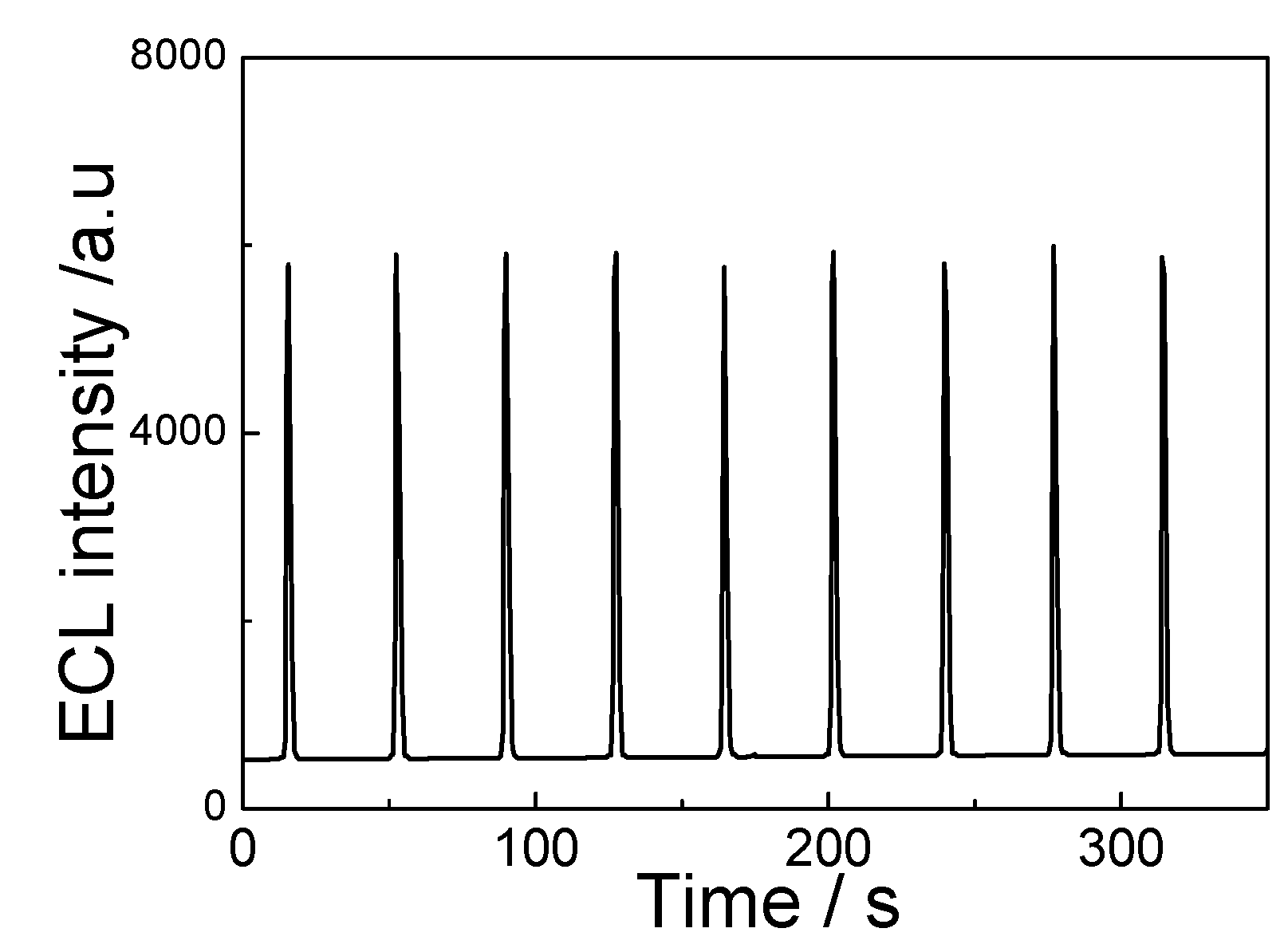 As shown in Figure 9, when consecutive scans from 0 to −1.6 V were performed for nine cycles, no obvious change of the ECL intensity of the immunosensor curve using 5 pg/mL ATM1 solution was observed. The ECL signals were strong and stable, suggesting that the immunosensor was suitable for ECL detection.