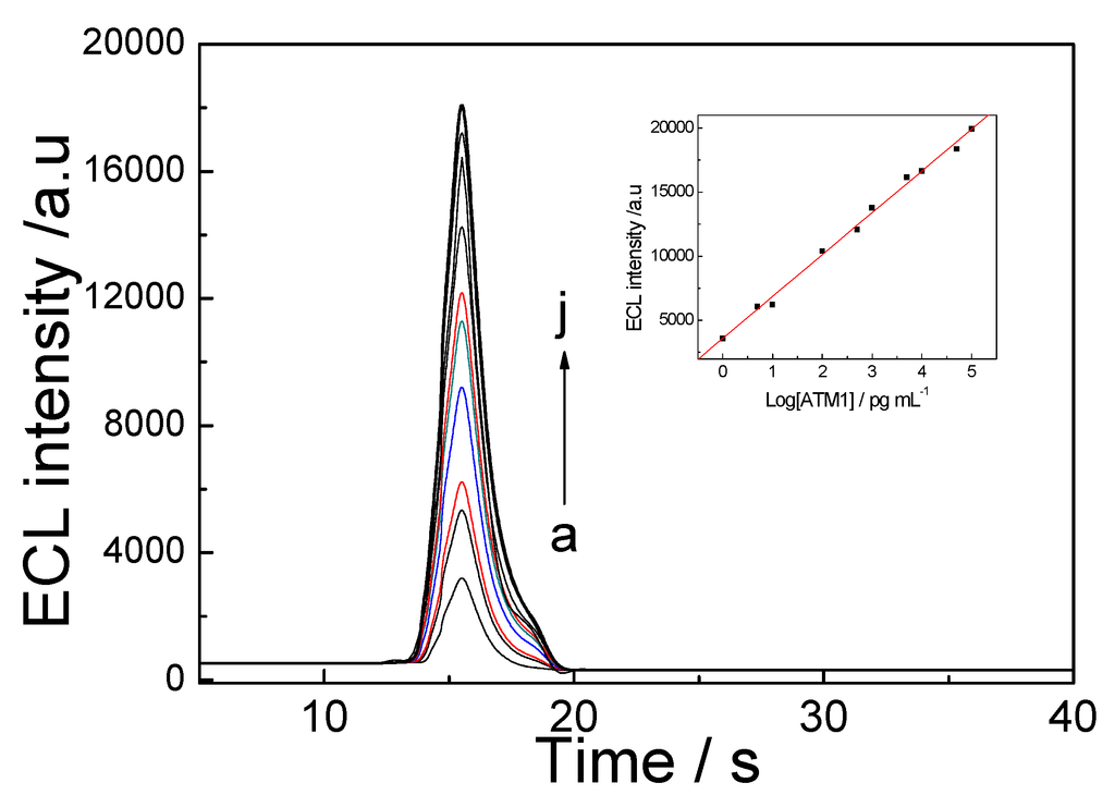 ECL profiles of the immunosensor before (a) and after (b–j) incubating in different concentrations of ATM1 in pH 7.4 PBS containing 0.1 mol/L KCl and 0.1 mol/L K2S2O8. ATM1 concentration (pg/mL): (a) 0; (b) 5; (c) 10; (d) 100; (e) 5.0 × 102; (f) 1.0 × 103; (g) 5.0 × 103; (h) 1.0 × 104; (i) 5.0 × 104;.(j) 1.0 × 105, Inset A: linear plots of ECL intensity vs. log (ATM1) concentrations.