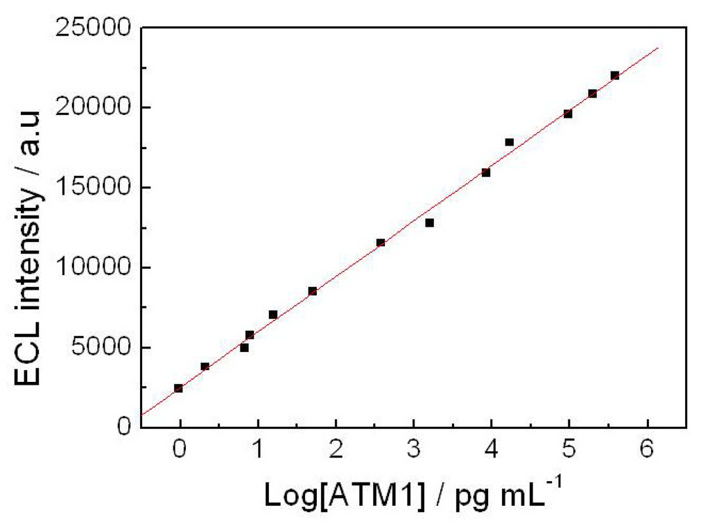 The standard curve of ECL intensity vs. log (ATM1) concentrations in milk samples.