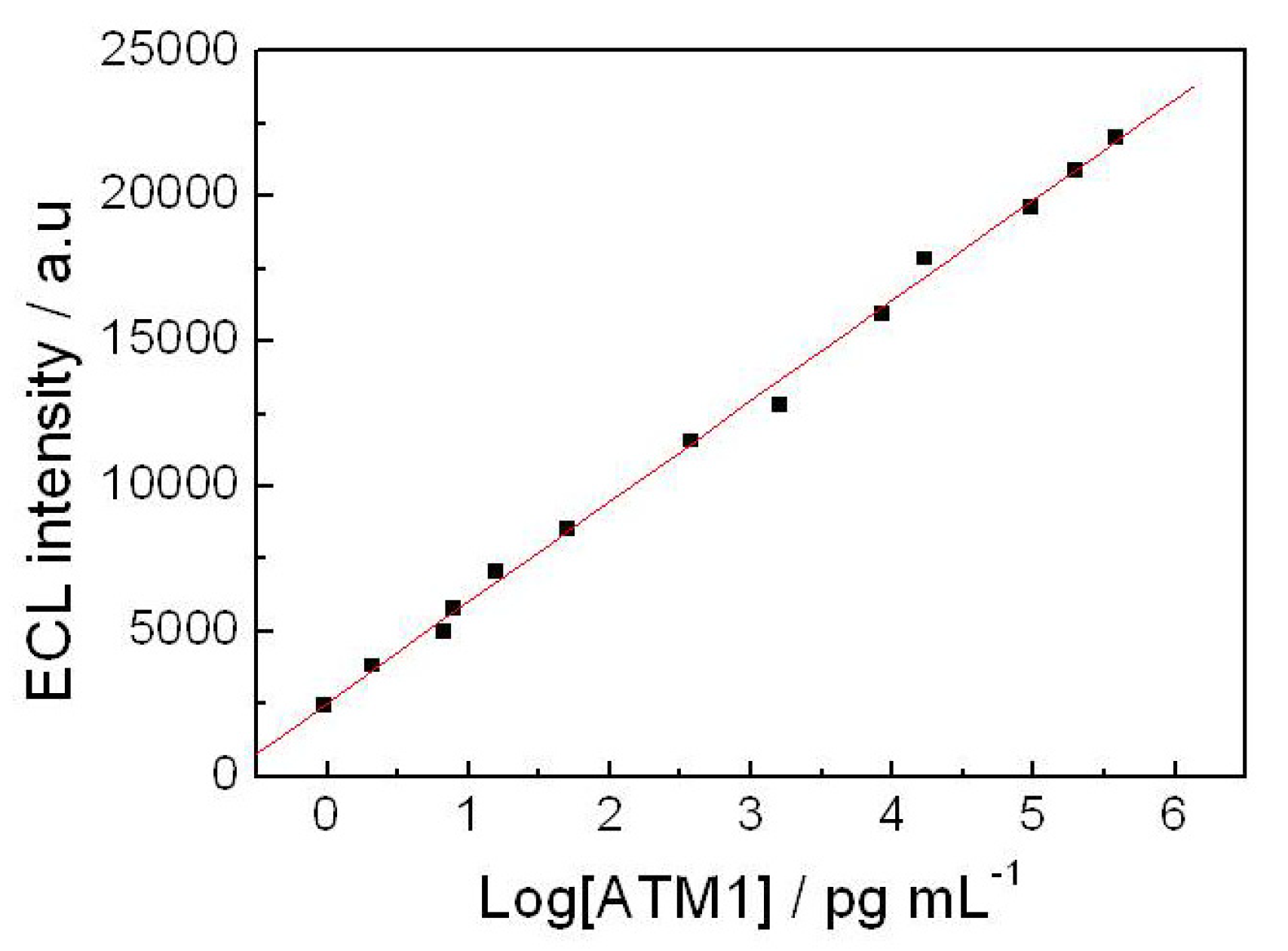 Under the optimal conditions, the ECL immunosensor was carried out to analyze various concentrations of ATM1 standard solution, and the ECL response was recorded (Figure 10). The intensity of the ECL showed linear dependence of the logarithm of ATM1 concentration in the range from 1.0 pg/mL to 100 ng/mL and the linear regression equation was I = 3520.3 + 1724 log(ATM1), with a coefficient of 0.9965. The limit of detection (LOD) was 0.3 pg/mL (S/N = 3).